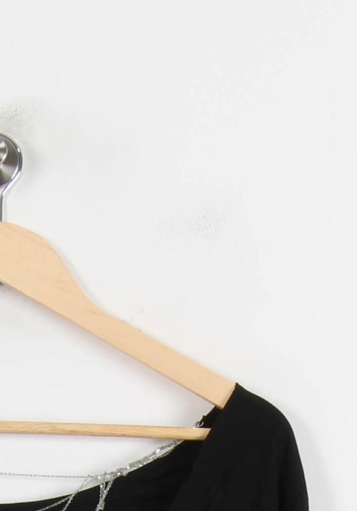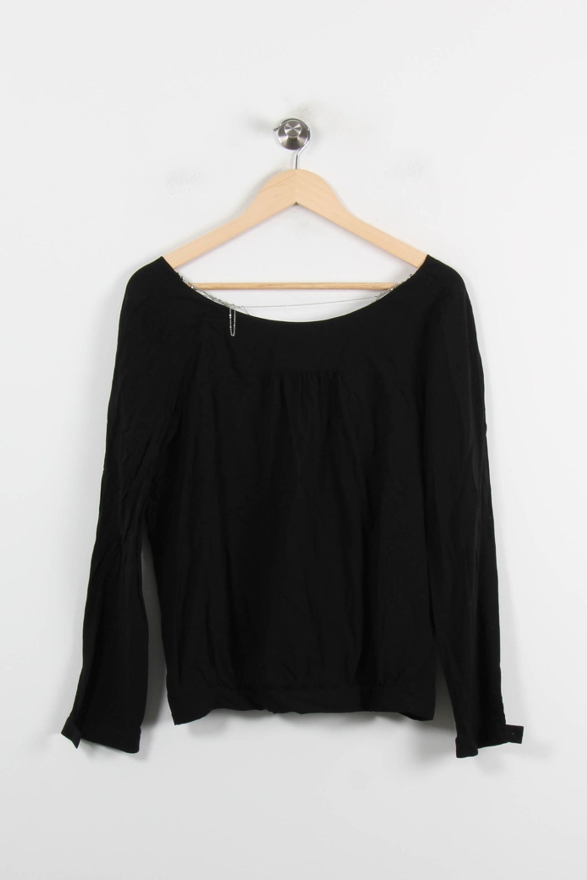 Top noir à manches longues ba&sh, taille M/38, affichant une encolure en V élégante. Confectionné dans une matière fluide, ce top se distingue par la simplicité de ses lignes et le détail subtil des poignets avec petite patte boutonnée qui lui confèrent une touche moderne et raffinée. Parfait pour une soirée chic ou un dîner élégant accompagné d’un pantalon tailleur.