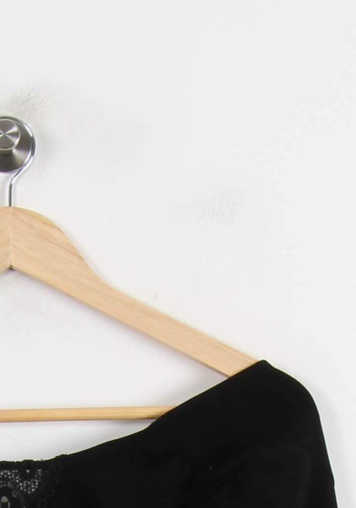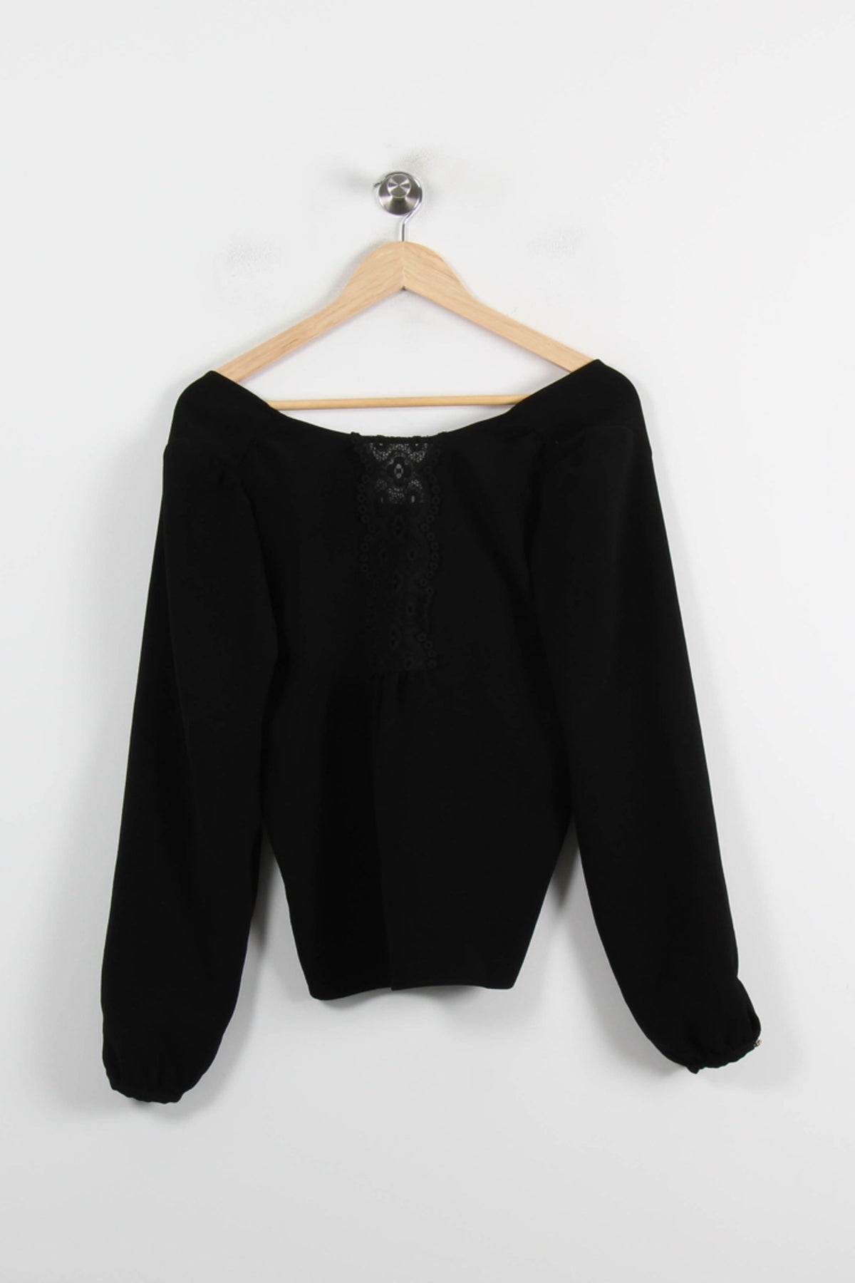 Top noir Sézane, taille S/36, à manches longues et encolure dégagée. La pièce présente un détail délicat en dentelle noire sur le devant, ajoutant une touche sophistiquée à son tissu uni et à sa coupe légèrement ajustée. Idéal pour un dîner élégant ou une soirée, ce top mettra subtilement en valeur votre style.
