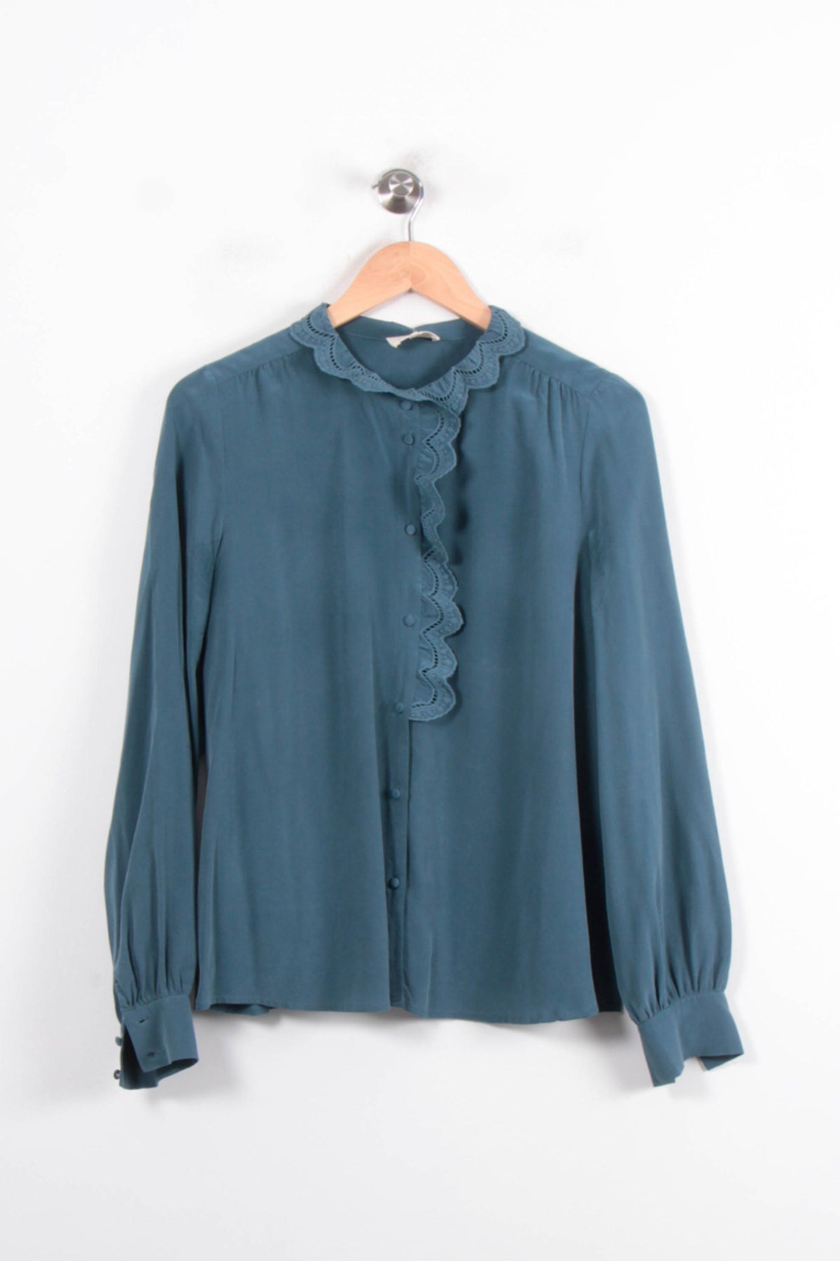 Blouse verte à manches longues Sézane, taille L/40, idéale pour sublimer vos looks élégants ou décontractés. Confectionnée dans une matière fluide, elle se distingue par un col élégant et une patte de boutonnage bordée d’un galon festonné délicat, apportant une touche raffinée et féminine à la pièce. Parfaite pour une journée au bureau ou un déjeuner entre amies, elle allie chic intemporel et confort.