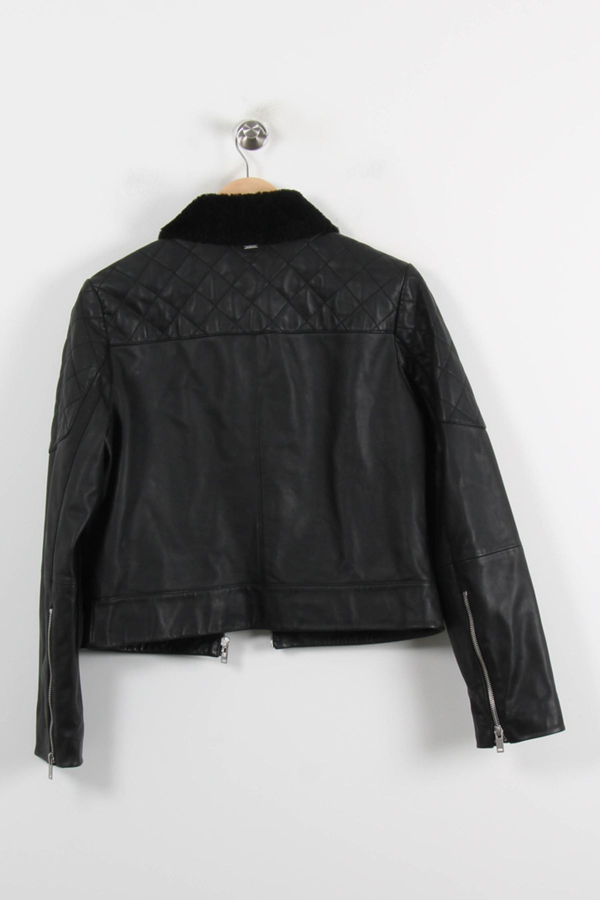 Veste noire IKKS en taille L/40, confectionnée dans un style biker chic et moderne, idéale pour une silhouette affirmée. La veste présente un col en fausse fourrure noire et des empiècements matelassés sur les épaules, ajoutant élégance et caractère à la peau lisse du vêtement. Parfaite pour une sortie citadine ou un dîner entre amis, elle apporte une touche sophistiquée à toute tenue.