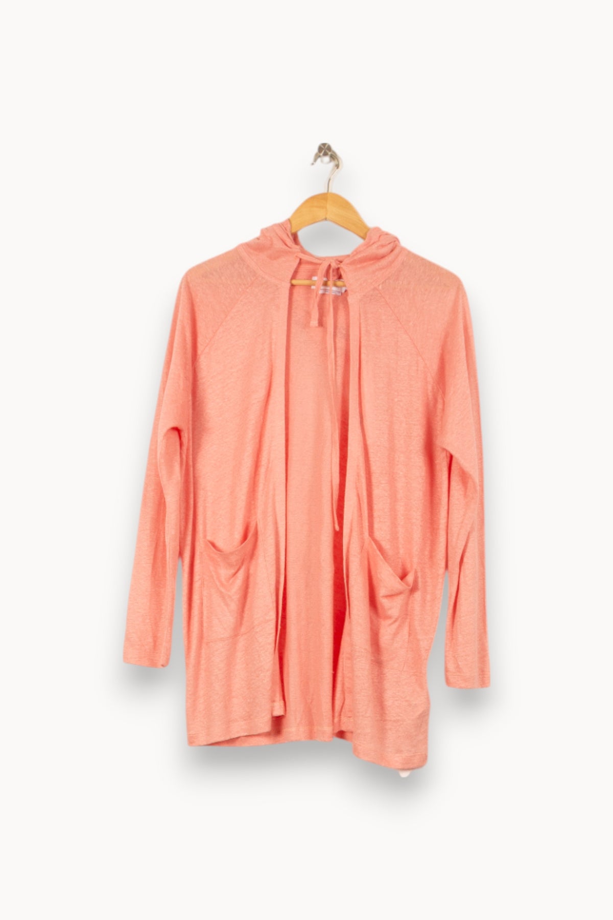 Cardigan à capuche rose Notshy Cashmere, taille S/36, à manches longues, coupe fluide ouverte sur le devant. Confectionné dans une matière douce, ce cardigan présente deux poches frontales et un lien à nouer au col, offrant une touche décontractée et élégante. Idéal pour réchauffer vos tenues lors d’une journée au bureau ou pour un après-midi détente en ville.
