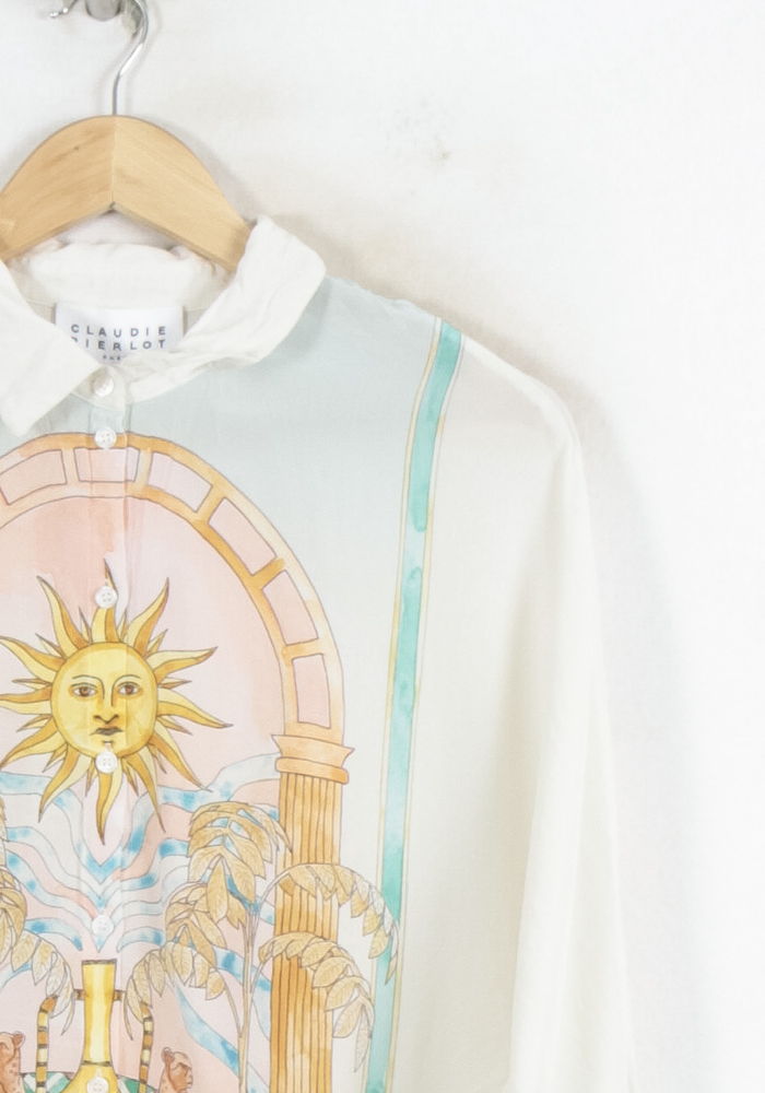Blouse imprimée Claudie Pierlot, taille L/40, en blanc, présentant un motif artistique au centre. Confectionnée dans une matière fluide, elle se distingue par un imprimé central coloré représentant un soleil, des colonnes et un vase, encadré de détails graphiques aux manches et sur l’avant, pour une allure singulière et élégante. Idéale pour apporter une touche raffinée à un look de journée lors d’un événement culturel ou d’un déjeuner en ville.