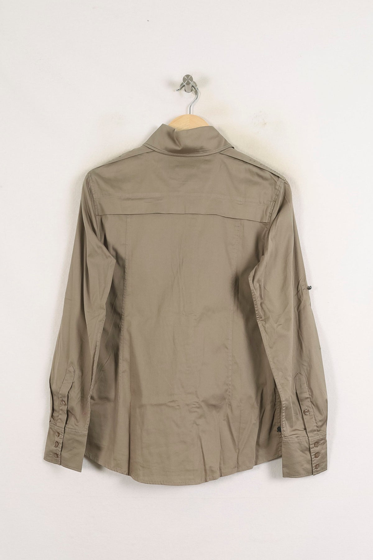Top chemise IKKS femme, couleur marron, taille XL/42. Confectionné dans une matière visiblement légère et souple, ce chemisier se distingue par sa coupe droite, ses deux poches poitrine à rabat boutonné et ses épaulettes discrètes, apportant une touche d'élégance et de structure. Idéal pour une journée de travail ou une sortie citadine, il accompagne aisément un pantalon tailleur pour un look chic et moderne.