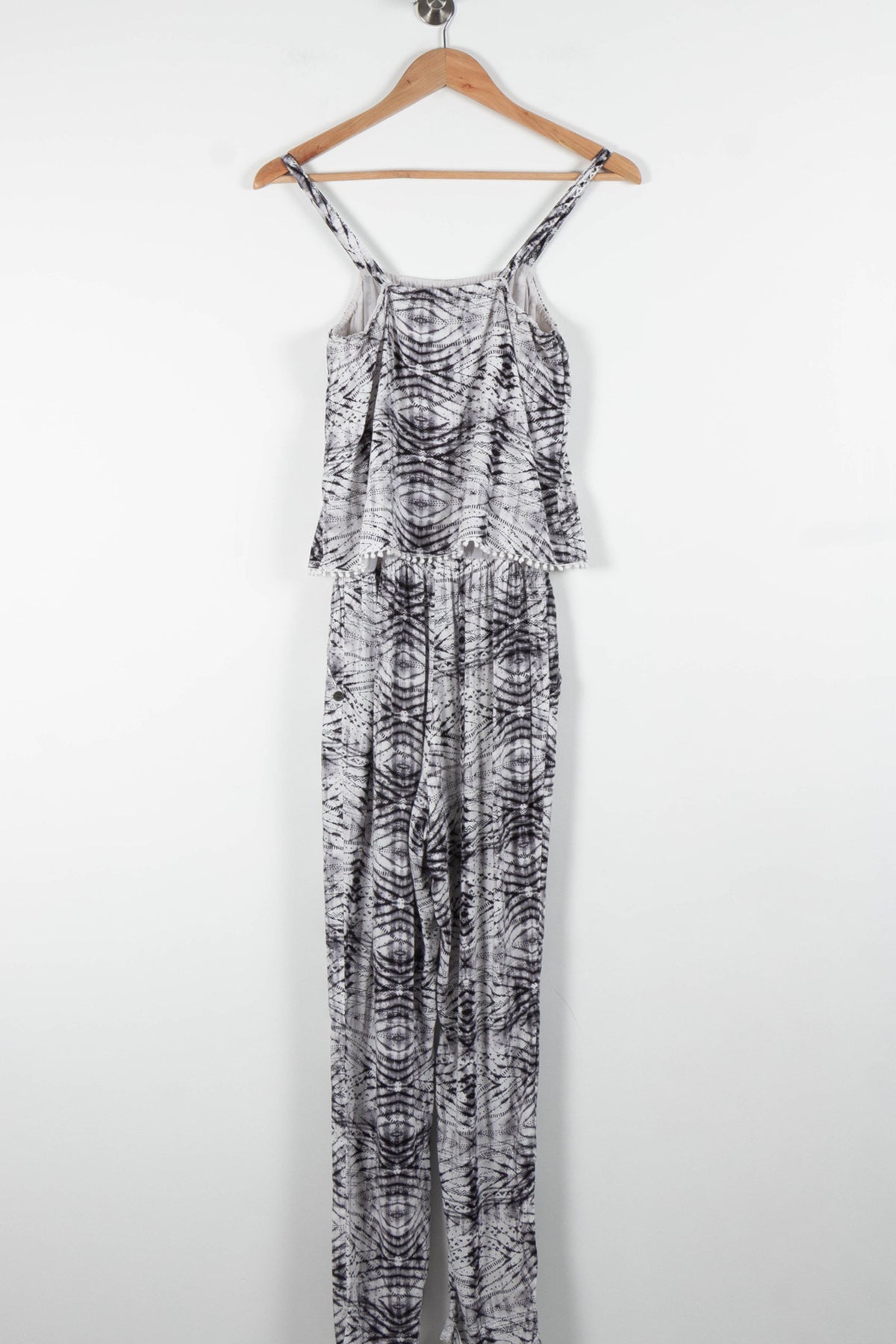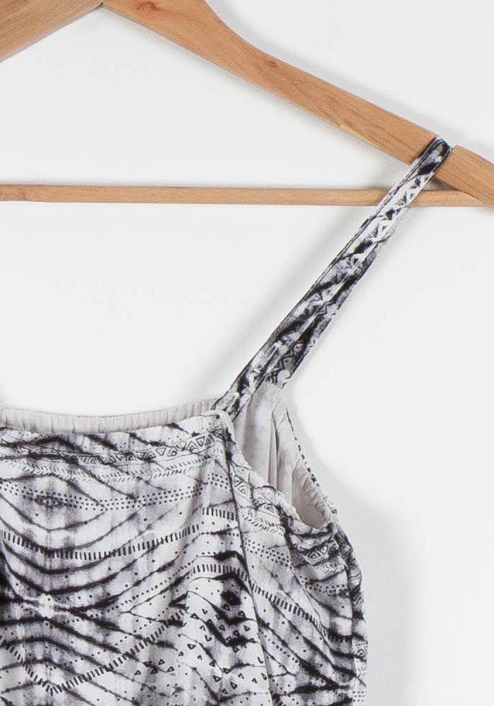 Combinaison pantalon IKKS, taille S/36, blanche à motif graphique noir, alliant élégance et modernité. La matière fluide et légère offre un tombé harmonieux, tandis que les fines bretelles et le motif graphique apportent une touche contemporaine et originale à cette pièce unique. Parfaite pour une sortie estivale ou un événement décontracté chic.