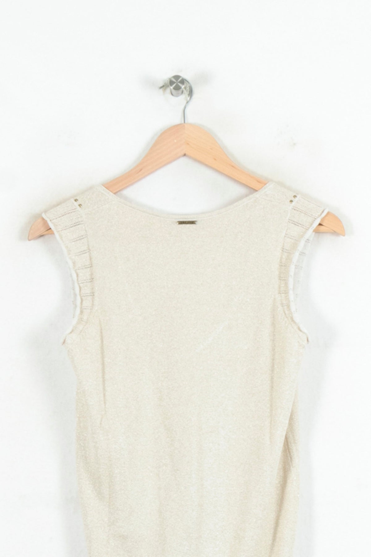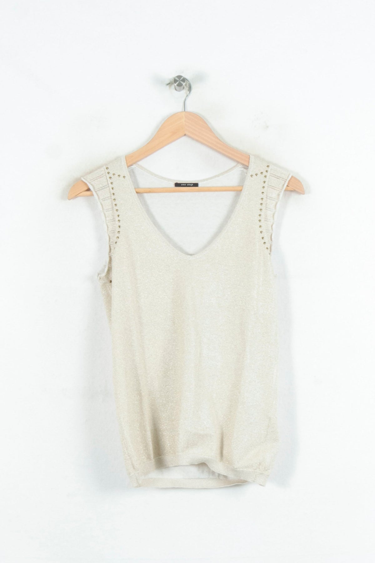 Top sans manches beige One Step, taille XS/34, au design épuré et à l'encolure en V élégante. La matière légère et subtilement texturée offre un toucher doux, tandis que des détails ajourés sur les épaules apportent une touche raffinée et originale à ce vêtement. Idéal pour une journée de travail estivale ou pour un déjeuner décontracté entre amis.