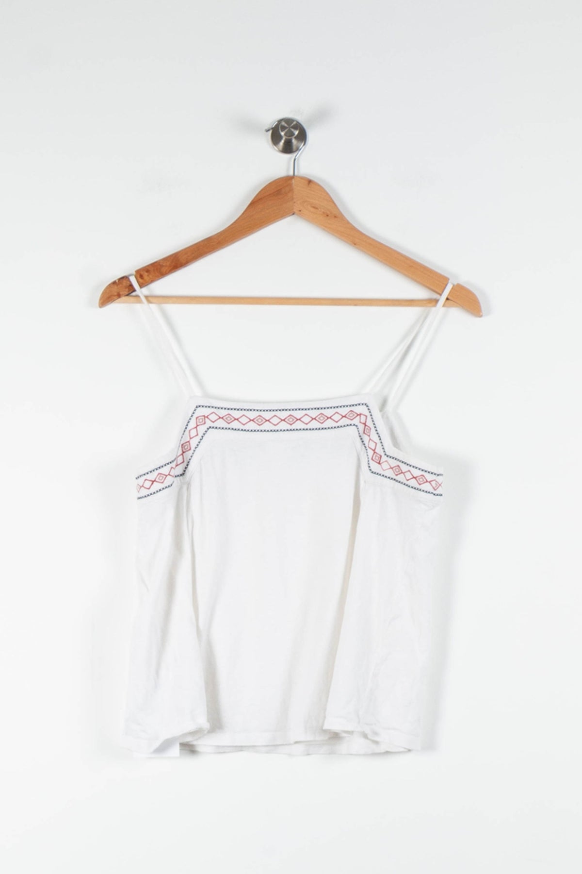 Top blanc à bretelles fines Sézane, taille S/36, orné d’une délicate broderie géométrique rouge et noire au niveau du col. La matière semble légère et confortable, tandis que les bords brodés apportent une note artisanale raffinée, signature du savoir-faire Sézane. Idéal pour une journée estivale ou un brunch décontracté, ce top sublimera vos looks d'été.