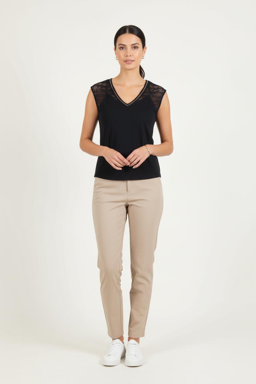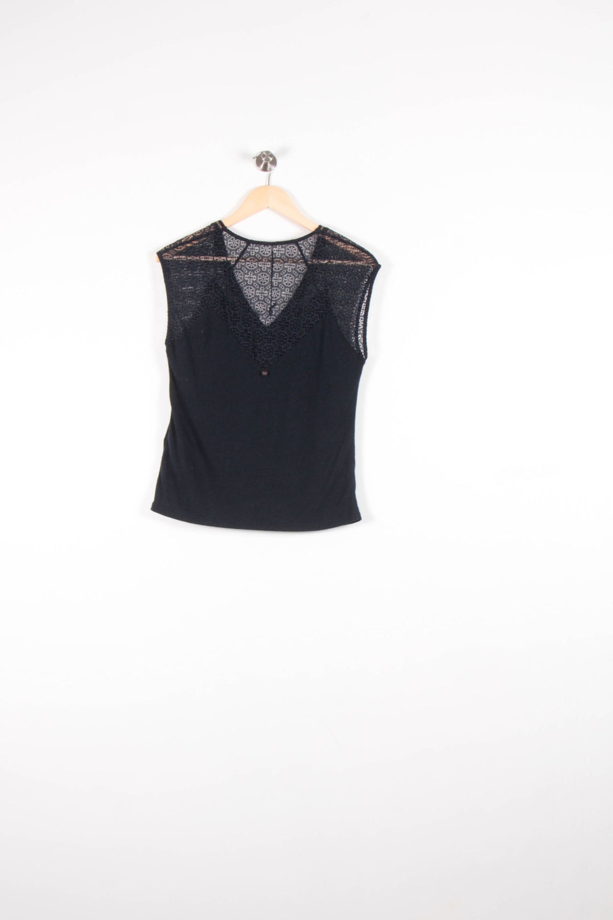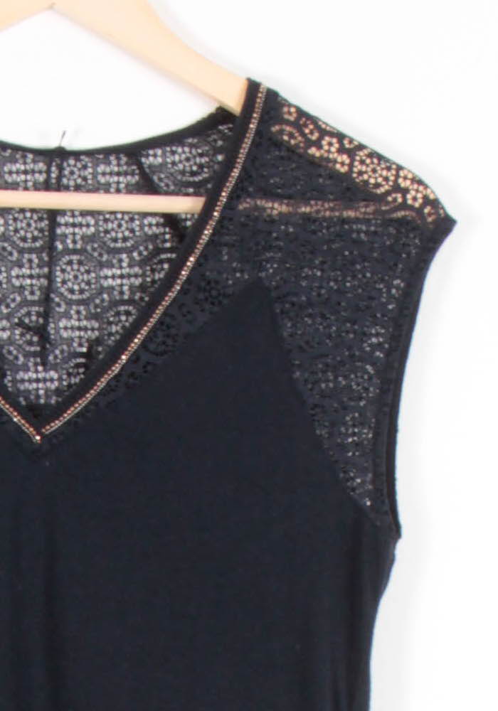Top bleu sans manches IKKS, taille M/38 : ce haut élégant de la marque IKKS se distingue par sa teinte bleu foncé, son encolure en V et sa coupe ajustée. Ce top se caractérise par des empiècements en dentelle délicate au niveau des épaules et du haut du dos, apportant une touche raffinée et féminine à la pièce. Idéal pour une soirée estivale ou un dîner entre amis, il s’accorde facilement à une tenue chic et décontractée.