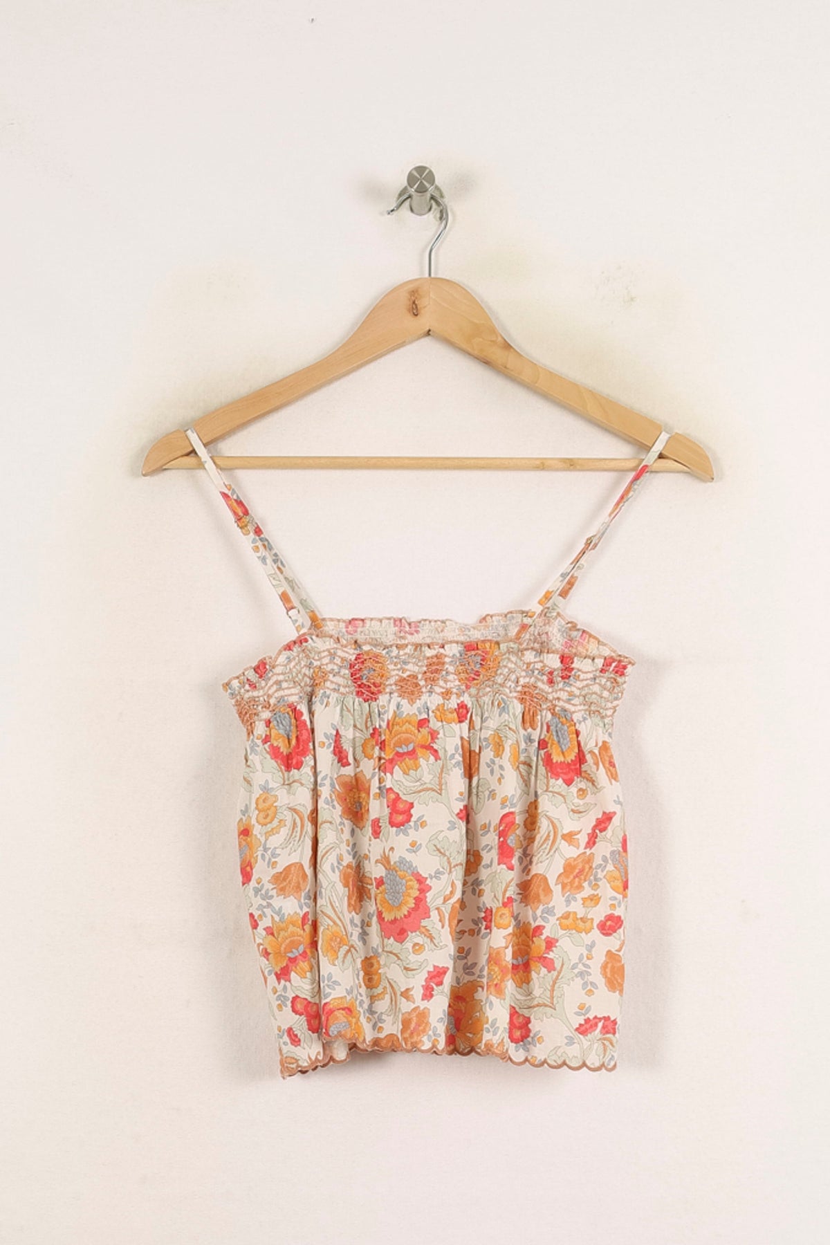 Top multicolore Louise Misha, taille M/38, à fines bretelles et encolure smockée apportant une allure féminine et estivale. Confectionné dans une matière légère à imprimé floral, ce haut séduit par ses finitions délicates comme la broderie à la base et sa coupe fluide, qui lui confèrent une identité bohème et raffinée. Idéal pour une journée estivale ou une sortie décontractée entre amis.