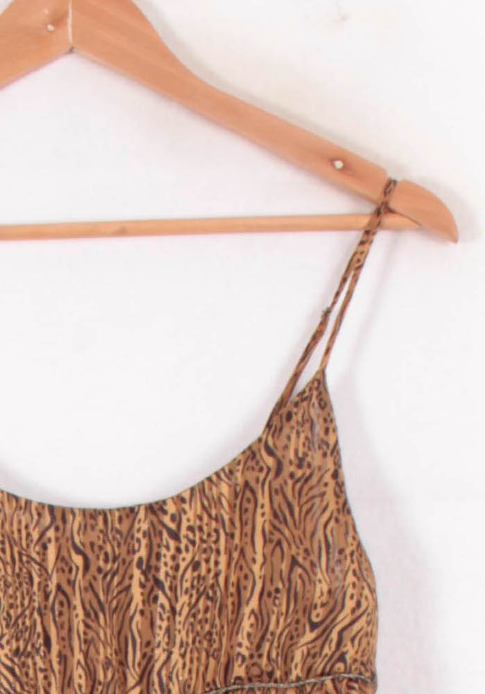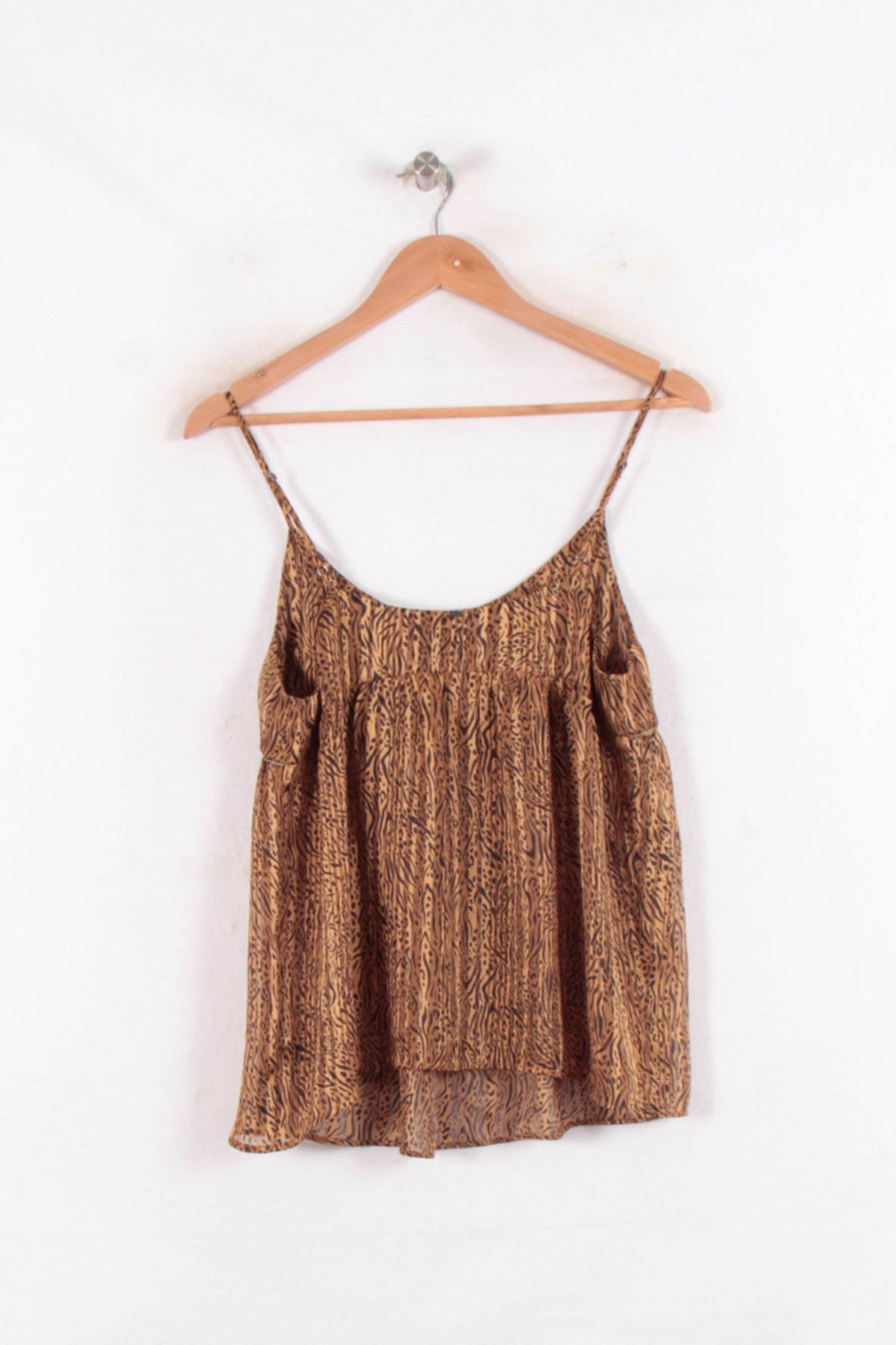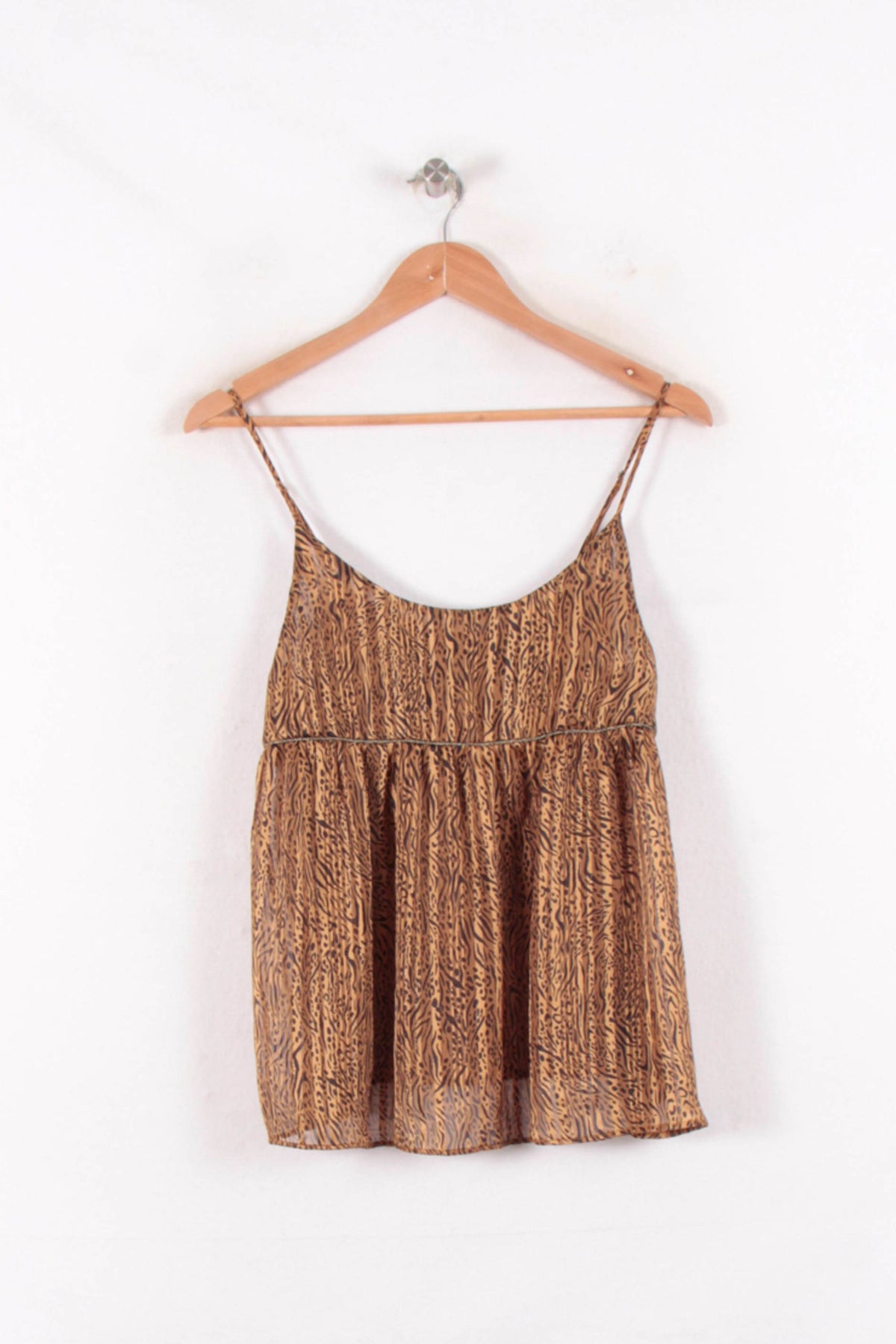 Top à bretelles fines imprimé doré IKKS, taille M/38, marque IKKS. Confectionné dans une matière légère, ce top se distingue par son imprimé animalier doré, apportant une touche d’originalité et d’élégance à la silhouette. Idéal pour une sortie estivale ou une soirée décontractée entre amis.