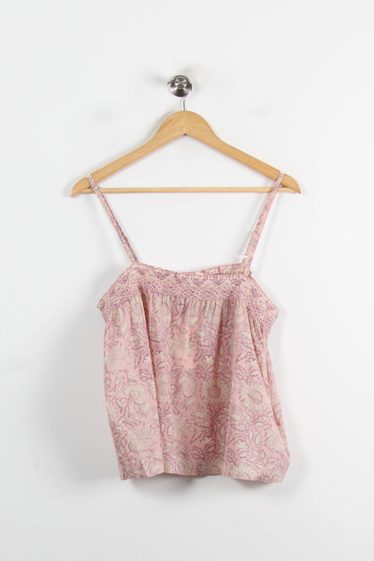 Top à fines bretelles Louise Misha, taille L/40, de couleur rose, idéal pour une allure fraîche et féminine. Confectionné dans une matière légère, ce top se distingue par son imprimé floral délicat et son plastron smocké, qui lui confèrent une touche raffinée et authentique. Parfait pour une journée estivale ou un brunch entre amis.