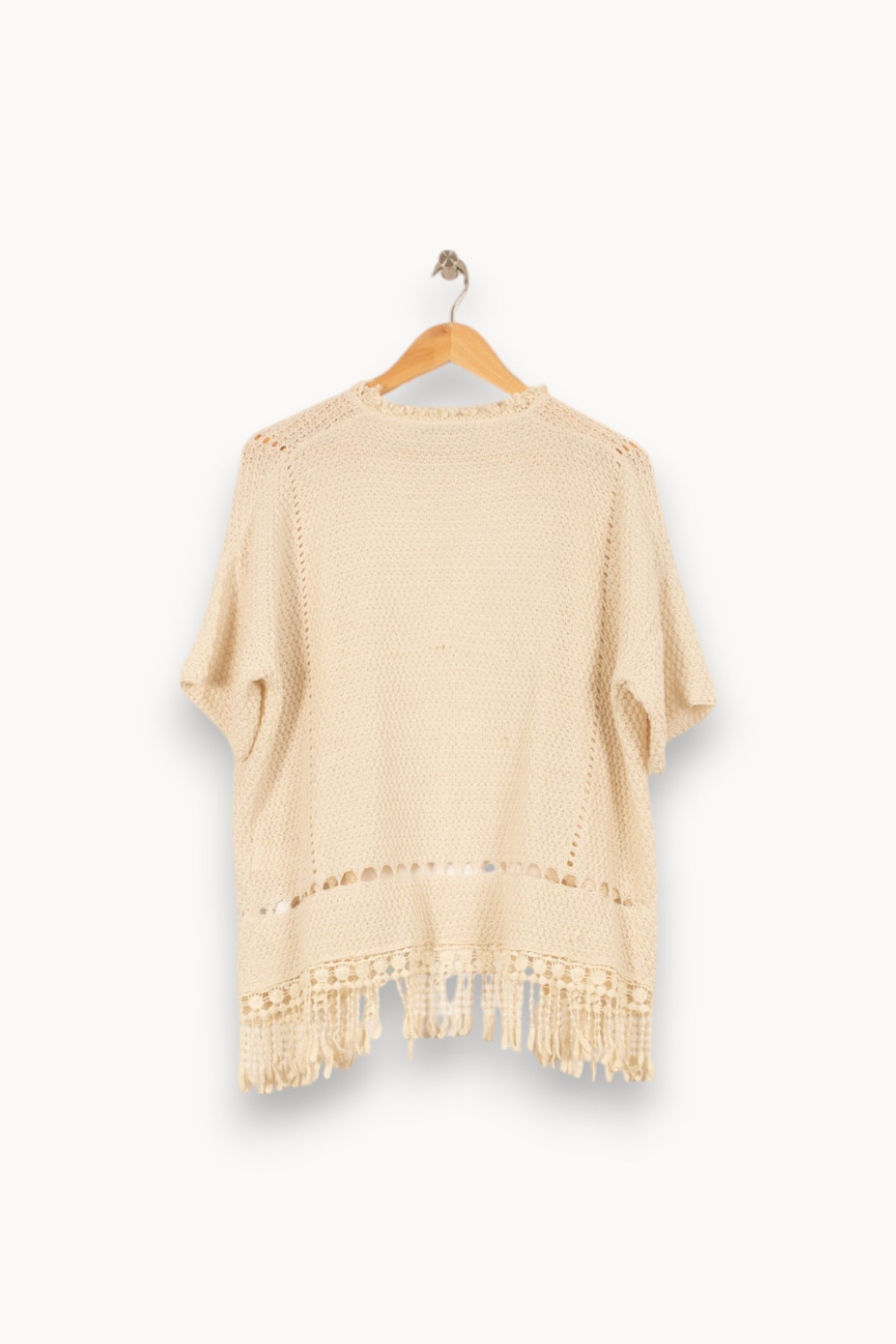 Cardigan écru à manches courtes La Fée Maraboutée, taille XS/34, parfait pour un look délicat et féminin. Ce modèle en maille présente une finition ajourée et des franges en bas, lui conférant une allure bohème raffinée et distincte. Idéal pour une promenade printanière ou une soirée estivale décontractée.