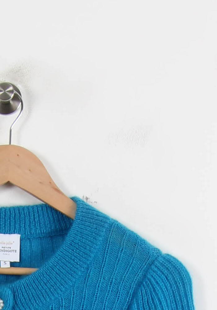 Cardigan côtelé bleu Petite Mendigote, taille S/36, parfait pour sublimer votre garde-robe avec élégance. Confectionné dans une maille épaisse à fines côtes, ce modèle se distingue par ses boutons bijou ornés, qui apportent une touche raffinée et unique à ce basique revisité. Idéal pour une journée au bureau ou un dîner en ville, porté sur un chemisier ou une robe fluide.