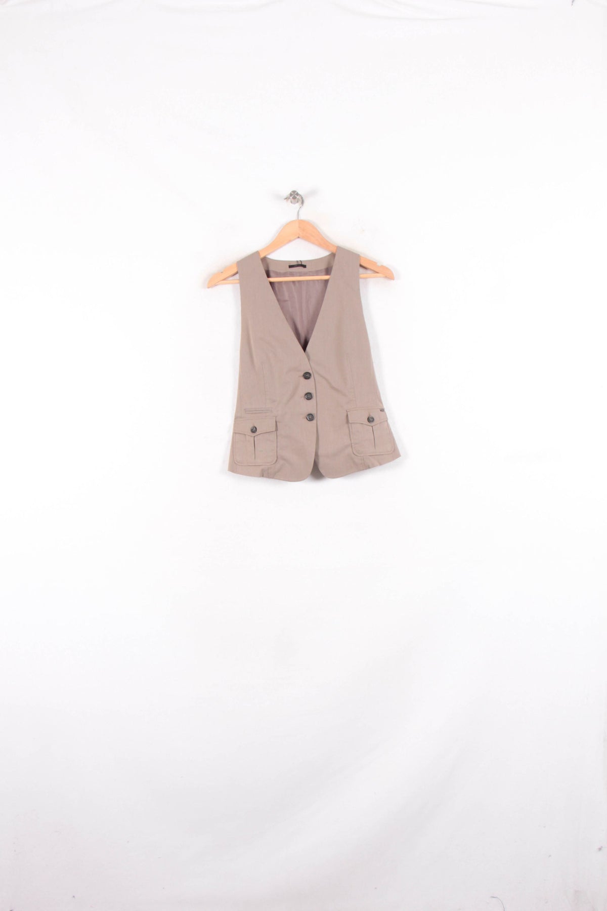 Gilet sans manches marron IKKS, taille L/40, élégant et structuré, idéal pour compléter une tenue chic. Confectionné dans une matière souple au toucher, il se distingue par son boutonnage central et ses deux poches à rabat boutonné, offrant une touche raffinée et fonctionnelle. Parfait pour une réunion professionnelle ou un rendez-vous en ville pour une allure sophistiquée et moderne.