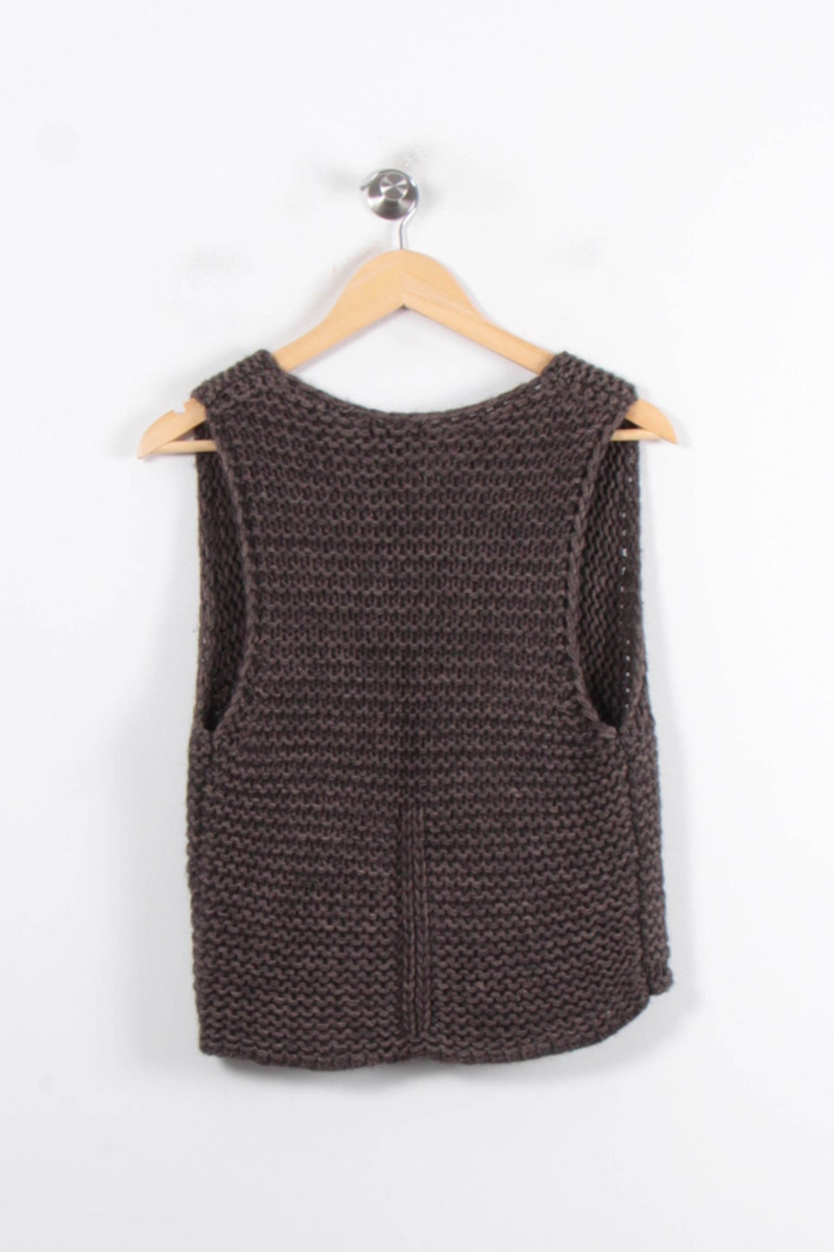 Gilet sans manches en maille marron Caroll, taille S/36, idéal pour une allure cosy et élégante. Sa matière épaisse en maille tricotée met en valeur un travail artisanal avec un aspect texturé unique, tandis que la coupe ouverte sans manches offre une silhouette confortable et contemporaine. Parfait pour réchauffer une tenue de bureau ou pour ajouter une touche douillette à un rendez-vous informel entre amis.