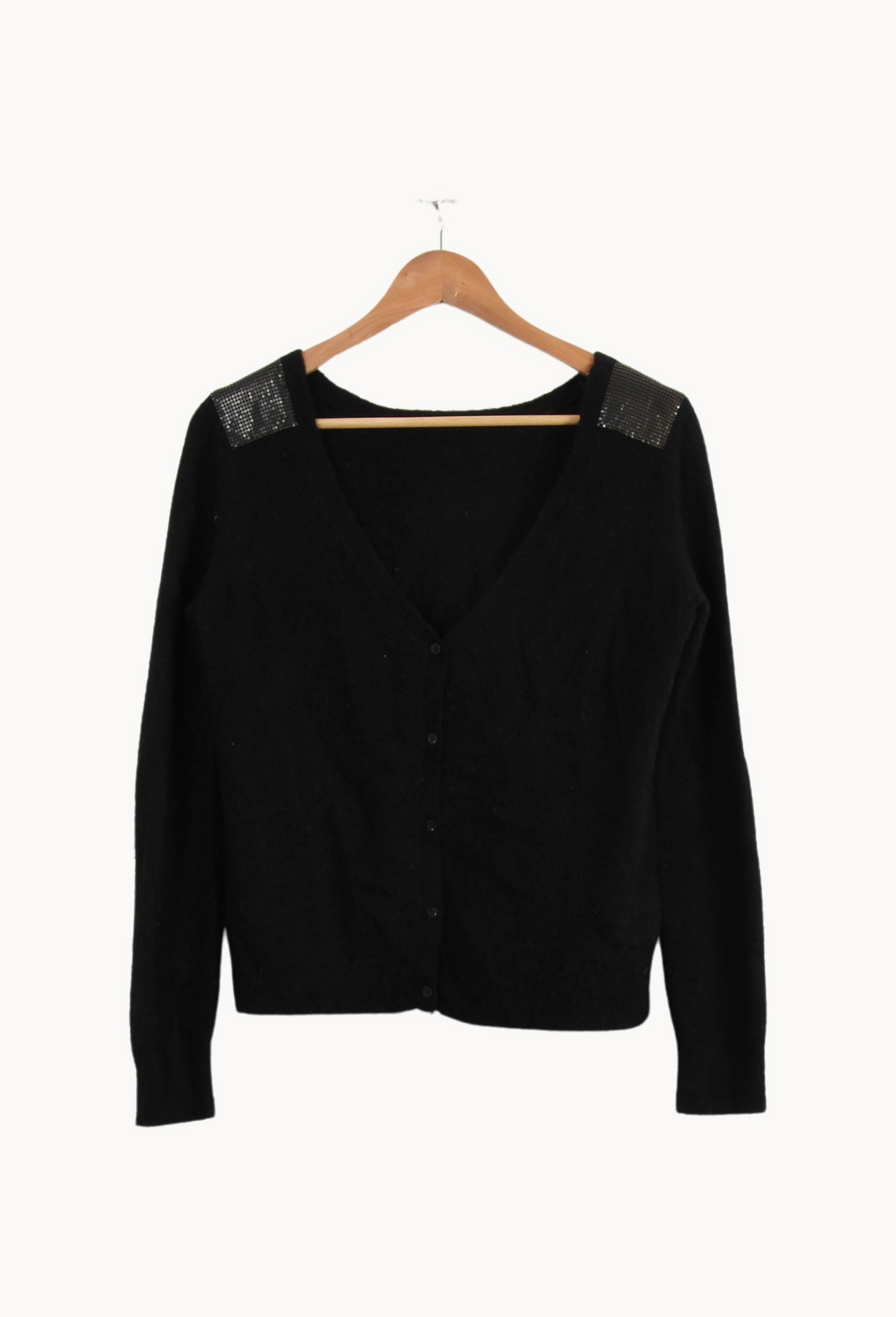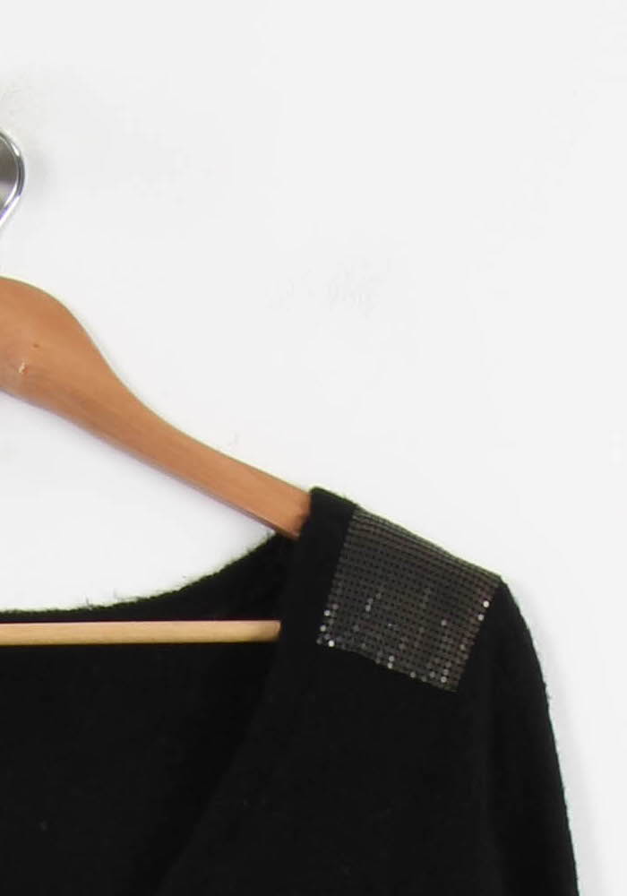 Veste noire IKKS taille M/38, modèle à manches longues avec fermeture par boutons, parfaite pour une allure élégante et contemporaine. Le tissu présente une finition douce et légère, rehaussée par des empiècements brillants aux épaules, signature originale qui confère à la veste un caractère unique et raffiné. Idéale pour sublimer une tenue de bureau ou apporter une touche sophistiquée à un dîner en ville.