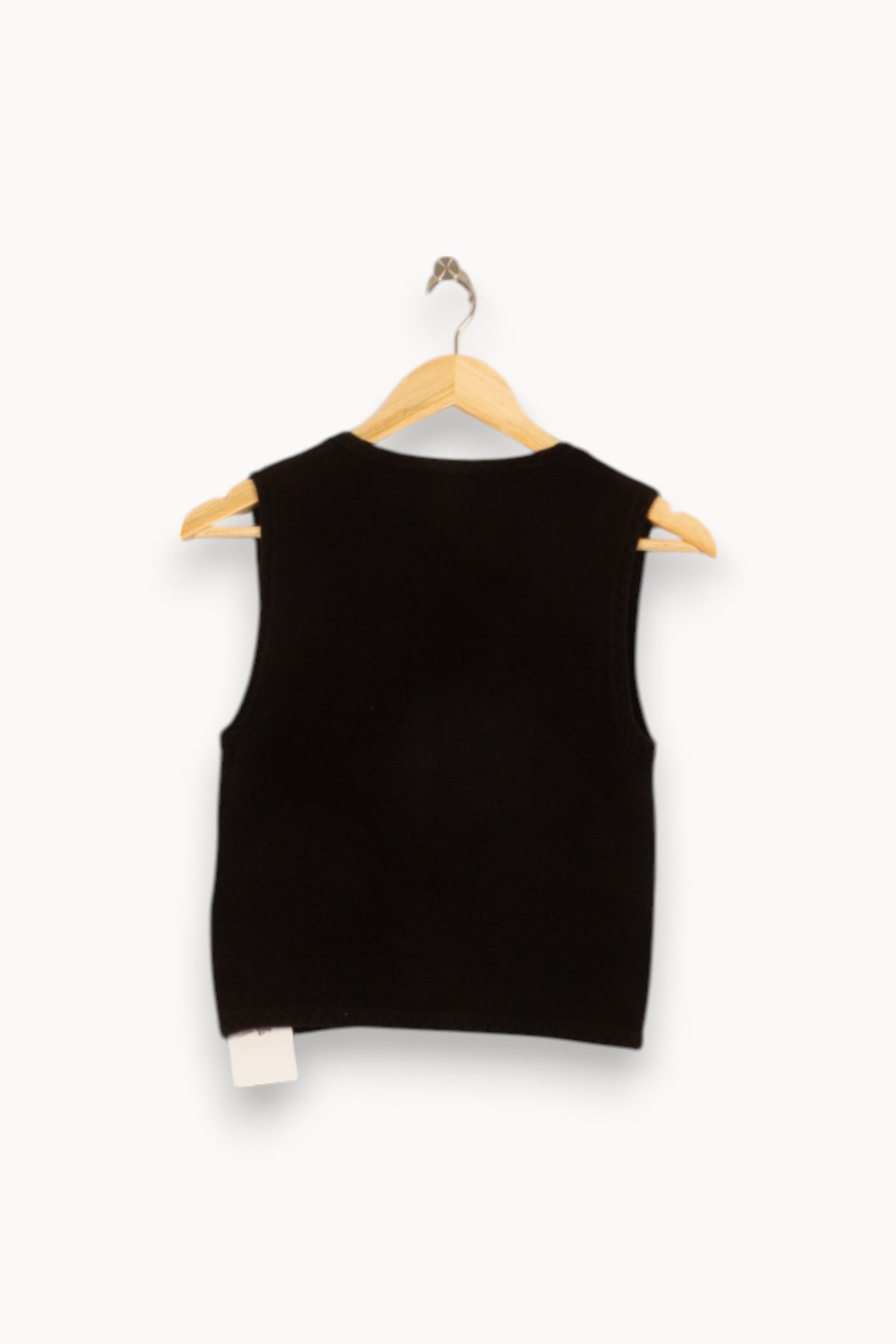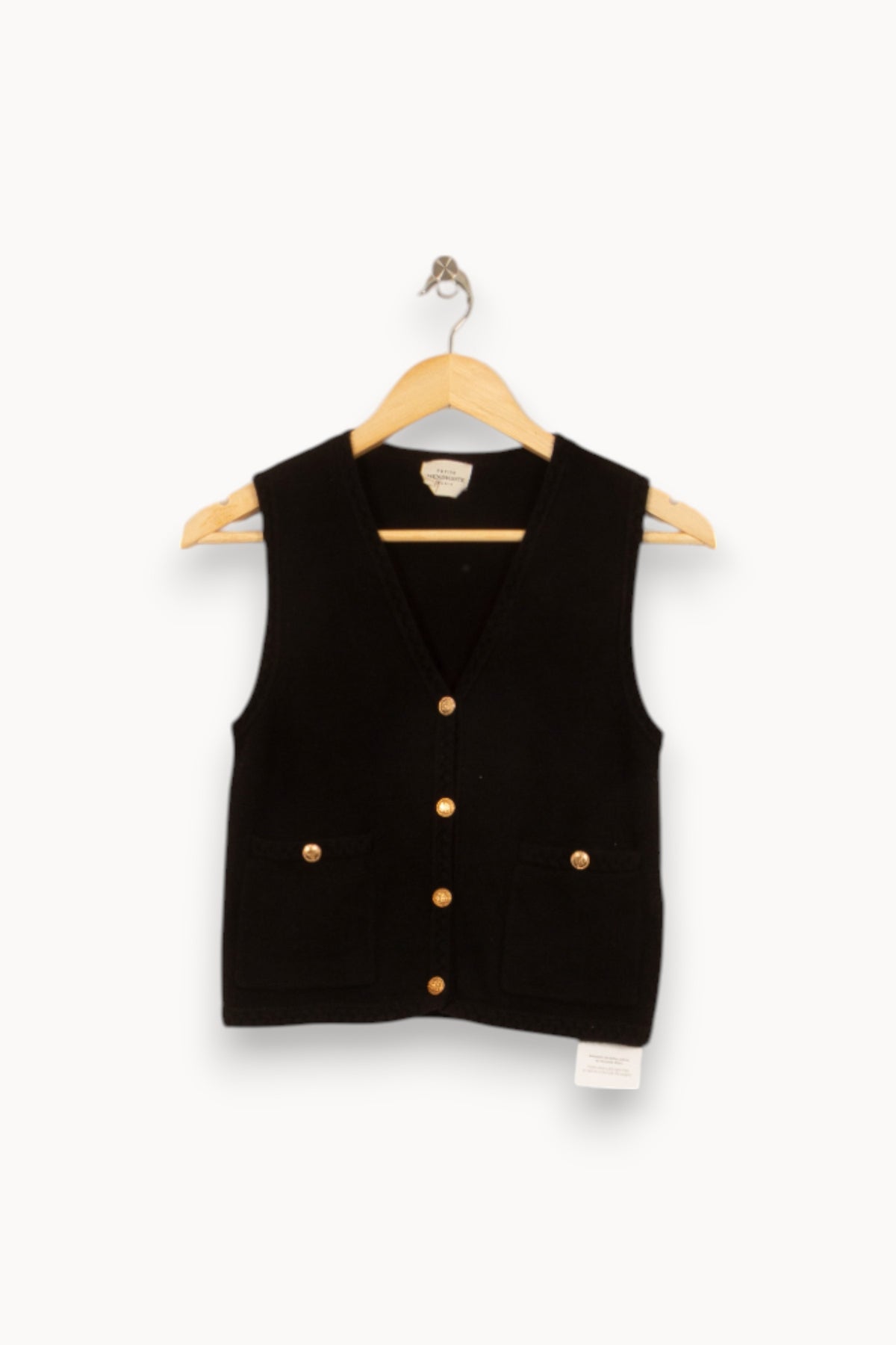 Gilet sans manches noir Petite Mendigote, taille S/36, parfait pour une touche élégante et contemporaine à votre garde-robe. Ce modèle se distingue par ses boutons dorés sur le devant et les poches, apportant une finition sophistiquée à la matière noire unie, tout en soulignant l’allure minimaliste du vêtement. Idéal pour réchauffer une tenue de bureau ou sublimer un look casual-chic lors d’un déjeuner en ville.