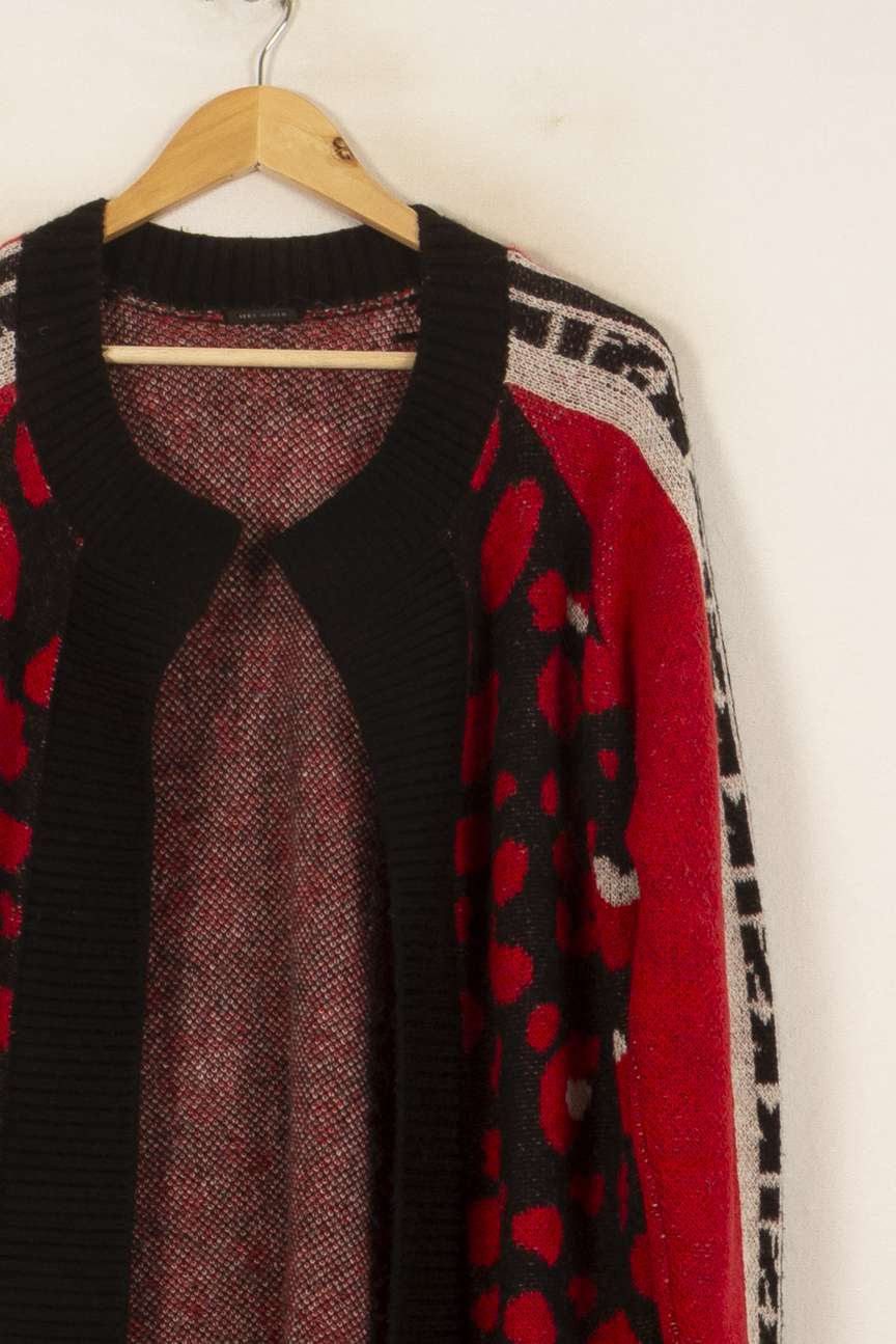 Cardigan long à motif léopard abstrait, col châle – Taille XL/42, marque non spécifiée. Confectionné dans une maille douce soulignée de larges bordures noires, ce cardigan se distingue par son imprimé audacieux rouge, noir et beige, apportant une touche artistique et moderne à toute tenue. Idéal pour réchauffer une silhouette lors d’une sortie décontractée ou pour dynamiser un look professionnel.
