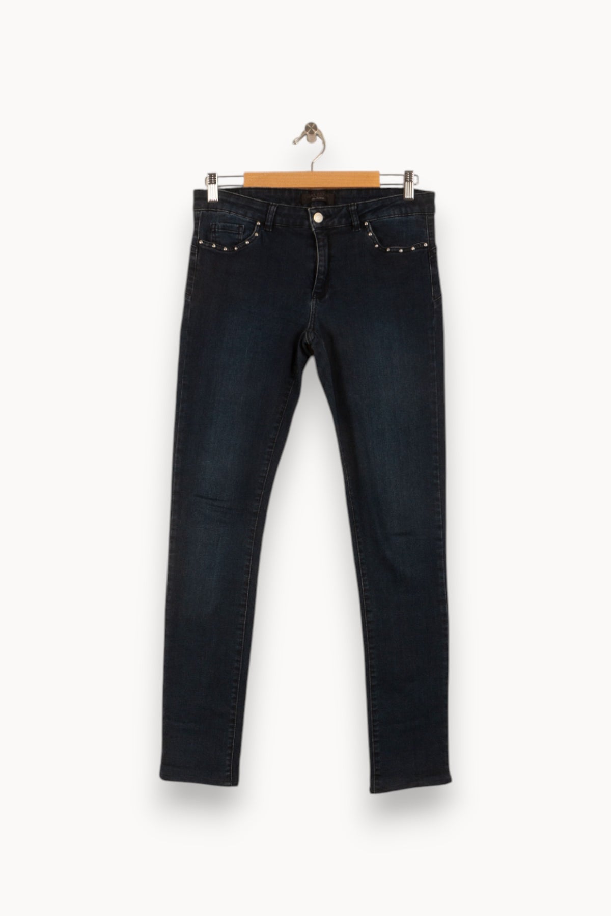 Jean bleu IKKS taille 42/XL, au style moderne et intemporel, parfait pour compléter toute garde-robe. Confectionné dans une toile denim de qualité, ce jean se distingue par ses rivets décoratifs métalliques sur les poches avant, apportant une touche d’originalité et de raffinement. Idéal pour une journée décontractée en ville ou un dîner élégant entre amis.