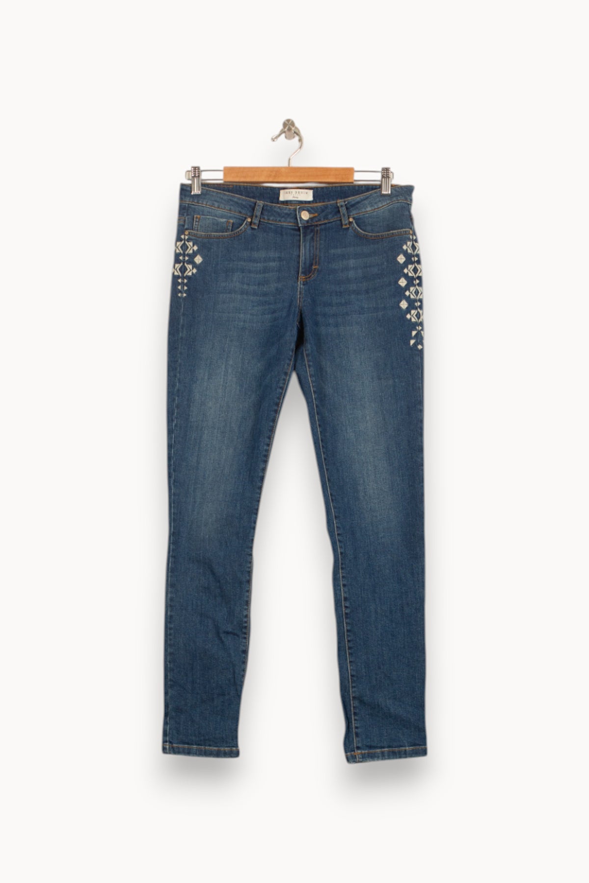 Jean bleu IKKS taille L/40, orné de broderies délicates au niveau des poches avant. Confectionné en denim de qualité, ce pantalon se distingue par ses broderies géométriques qui apportent une touche de raffinement et d’originalité à une coupe classique. Un choix parfait pour une journée décontractée ou un déjeuner en ville.
