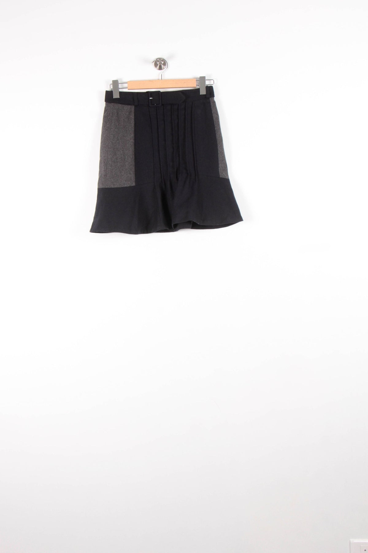 Jupe courte noire Claudie Pierlot taille S/36, élégante et moderne, ornée d’empiècements gris contrastés et d’une ceinture intégrée ton sur ton. La matière semble fluide et légère, tandis que les plis sur le devant et les jeux de textures apportent sophistication et singularité à la pièce. Idéale pour un rendez-vous professionnel ou une sortie citadine raffinée.