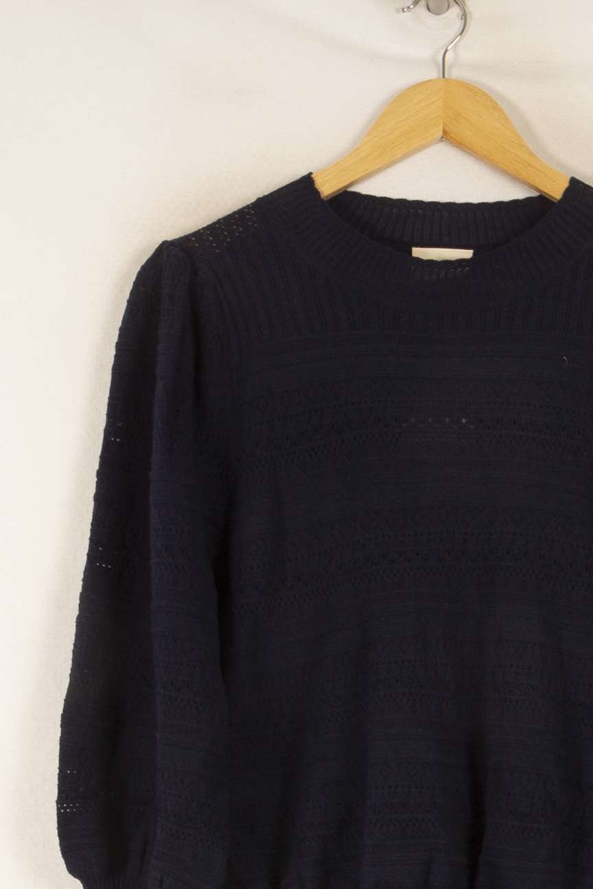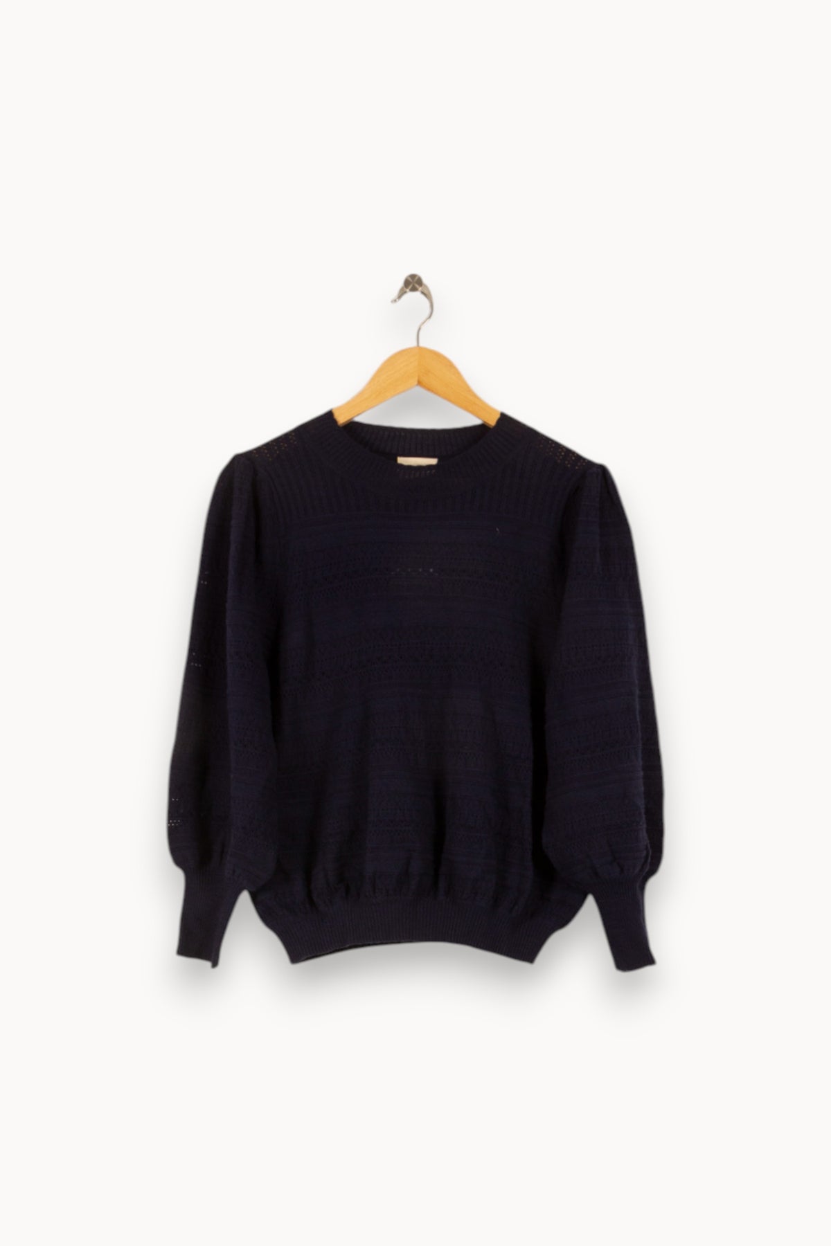 Pull bleu en maille Petite Mendigote, taille L/40, présentant une coupe classique à manches légèrement bouffantes. Sa maille texturée, ornée de motifs ajourés subtils, offre un raffinement discret tout en apportant du caractère à la pièce, pour un style élégant mais décontracté. Parfait pour une journée de travail ou une sortie entre amis, il se marie aisément avec un jean ou une jupe midi.