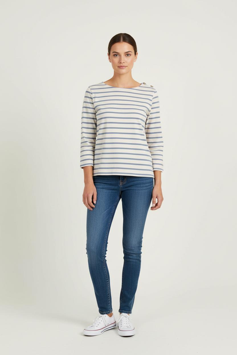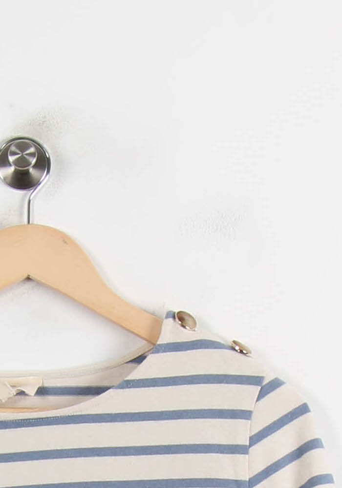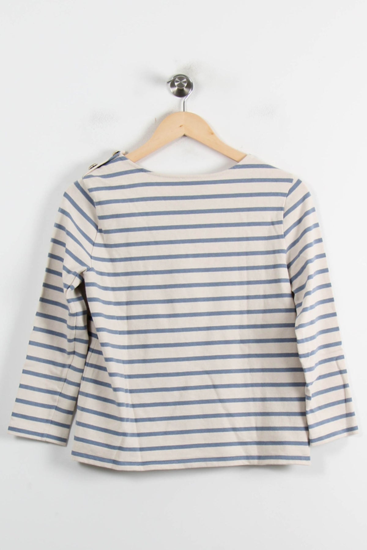 Pull marinière gris à rayures, Sézane, taille S/36. Confectionné dans une matière douce et confortable, ce pull présente de fines rayures horizontales et des boutons décoratifs sur l’épaule, lui conférant une touche élégante et intemporelle. Idéal pour une journée décontractée en ville ou un week-end en bord de mer.