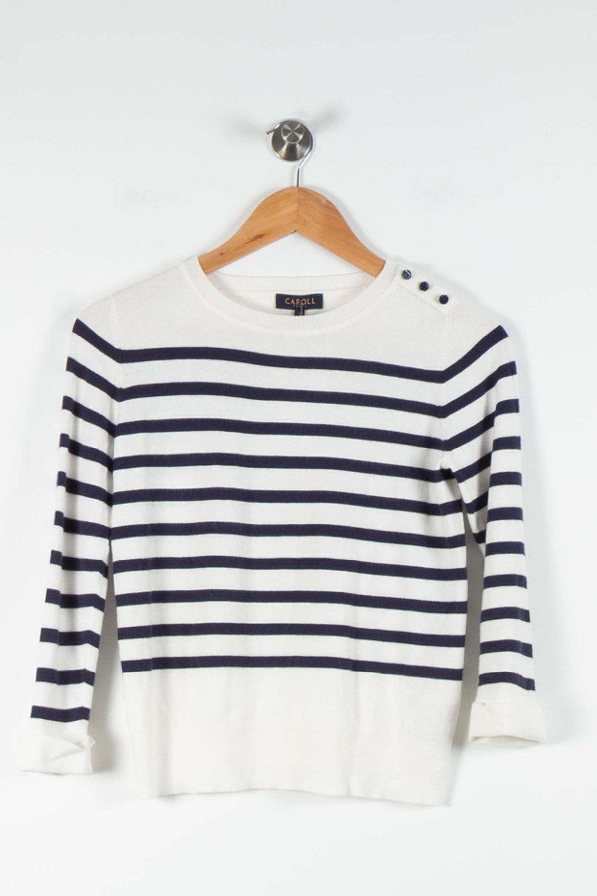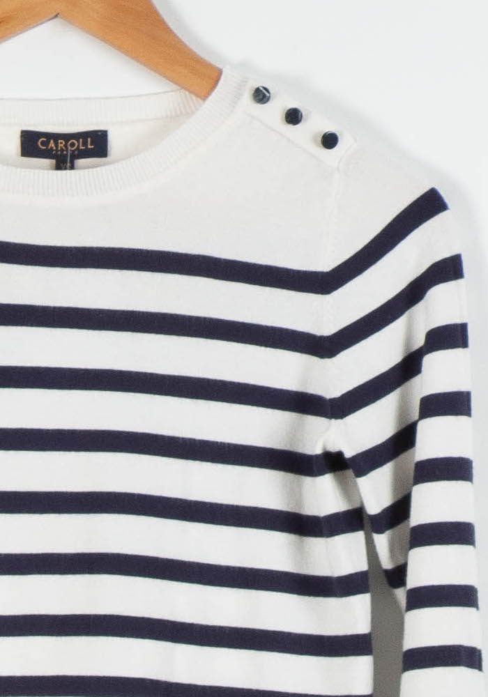 Pull marinière blanc à rayures bleues Caroll, taille XS/34, parfait pour un look chic et intemporel. Ce pull se distingue par ses rayures horizontales classiques et ses trois boutons décoratifs à l’épaule, qui ajoutent une touche d’originalité et de raffinement à une maille douce et agréable à porter. Idéal pour une sortie en bord de mer ou pour composer une tenue élégante au quotidien.