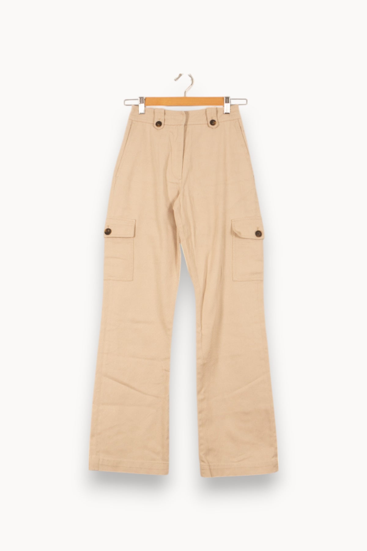 Pantalon cargo beige Claudie Pierlot, taille XS/34, confectionné avec soin pour une allure moderne et raffinée. Sa matière souple à l’aspect texturé et ses poches latérales à rabats avec boutons apportent praticité et caractère, tandis que les passants et détails boutonnés à la taille soulignent un fini distinctif. Parfait pour une journée citadine ou un rendez-vous décontracté, il associe confort et élégance au quotidien.