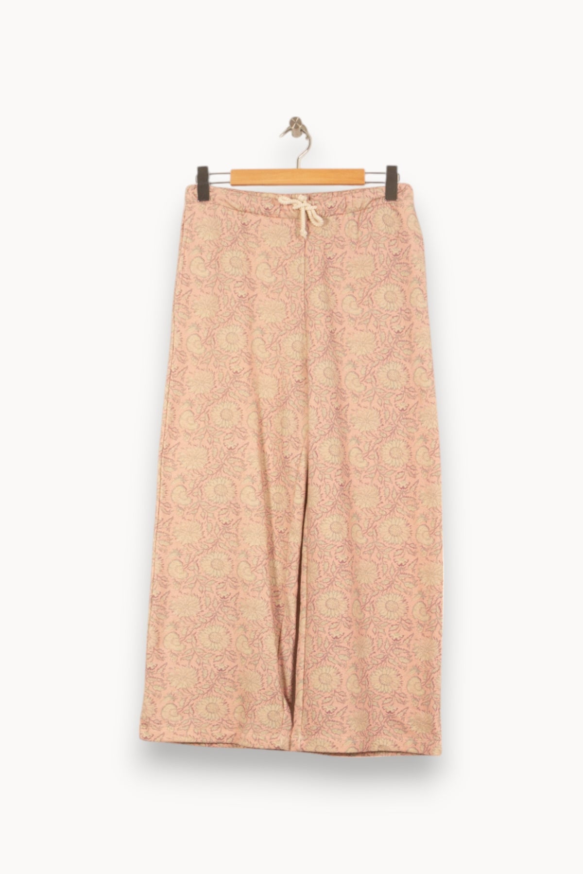 Pantalon large rose imprimé fleuri Louise Misha, taille S/36, alliant confort et élégance. Confectionné dans une matière légère et fluide, ce pantalon se distingue par son motif floral délicat et son lien à nouer à la taille, apportant une touche bohème unique à votre silhouette. Idéal pour une journée décontractée en ville ou une promenade estivale, associé à un top léger.