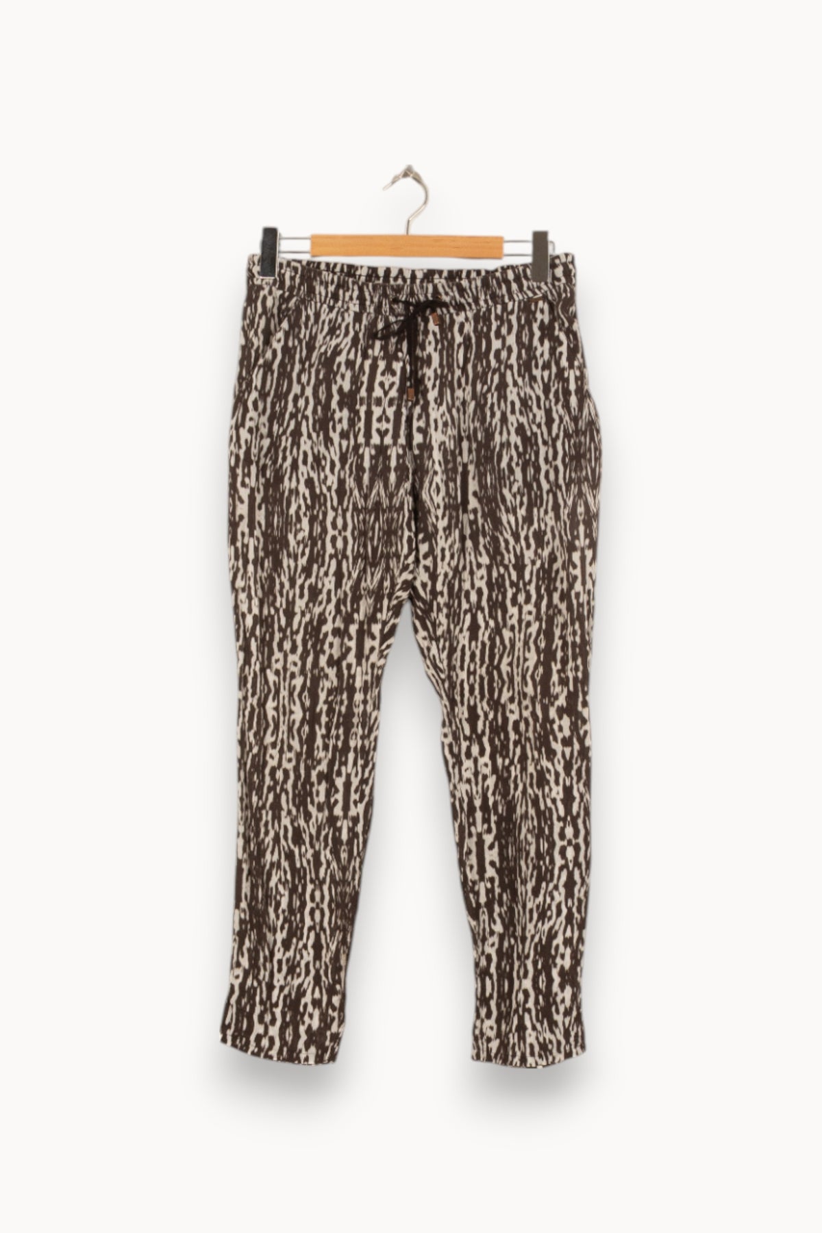 Pantalon multicolore IKKS, taille L/40 - un modèle signature de la marque, élégant et original. Confectionné dans une matière fluide et légère, il présente un imprimé graphique multicolore unique et une taille élastiquée avec lien de serrage, offrant à la fois confort et style moderne. Idéal pour une journée décontractée en ville ou un brunch entre amis.