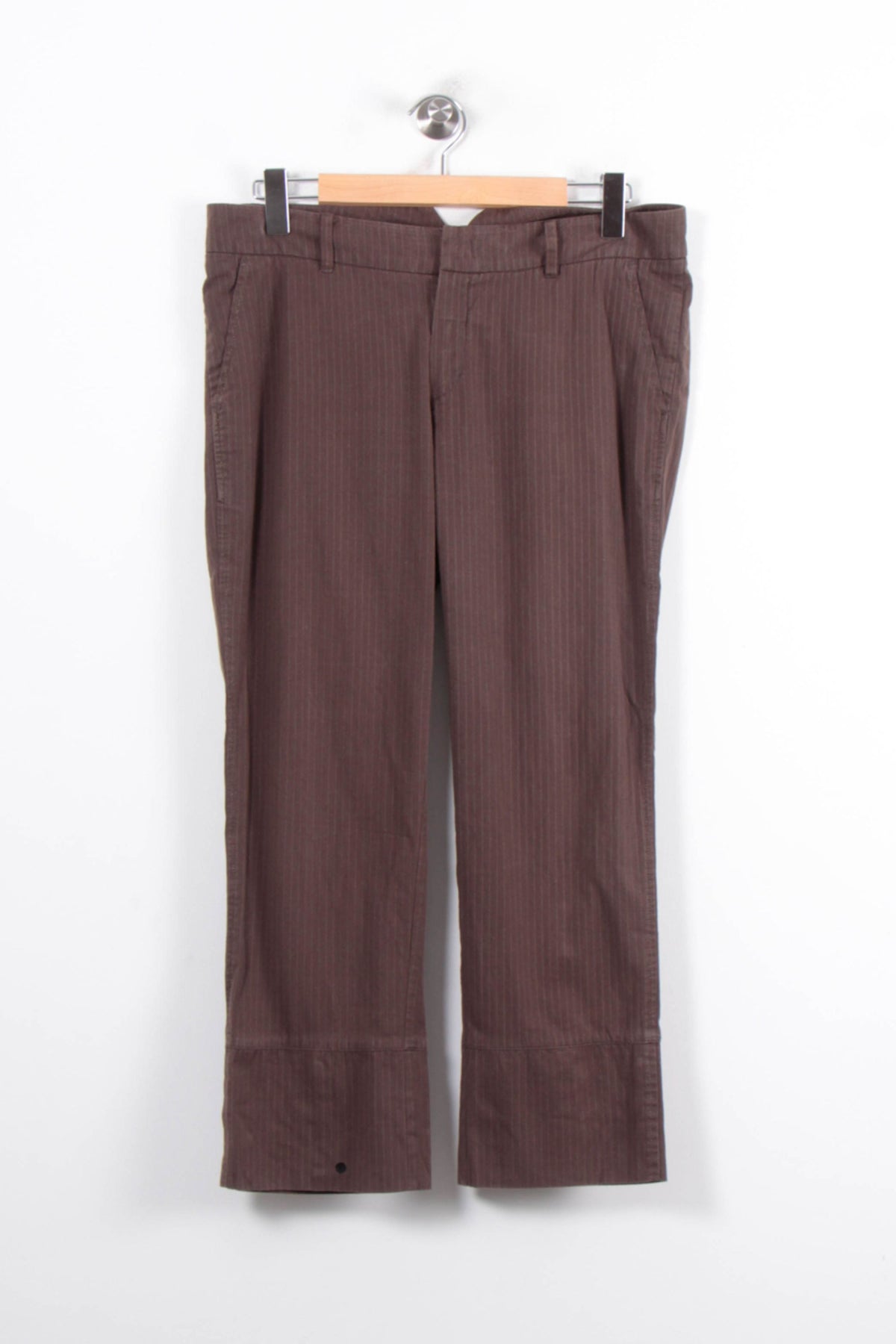 Pantalon marron à rayures fines IKKS, taille XXL/44, alliant sobriété et élégance pour une silhouette moderne et épurée. Confectionné dans une matière souple et agréable, il se distingue par ses rayures discrètes et sa finition soignée aux bas des jambes, apportant une touche de raffinement subtil. Idéal pour une journée de bureau ou un rendez-vous décontracté nécessitant une allure soignée sans effort.