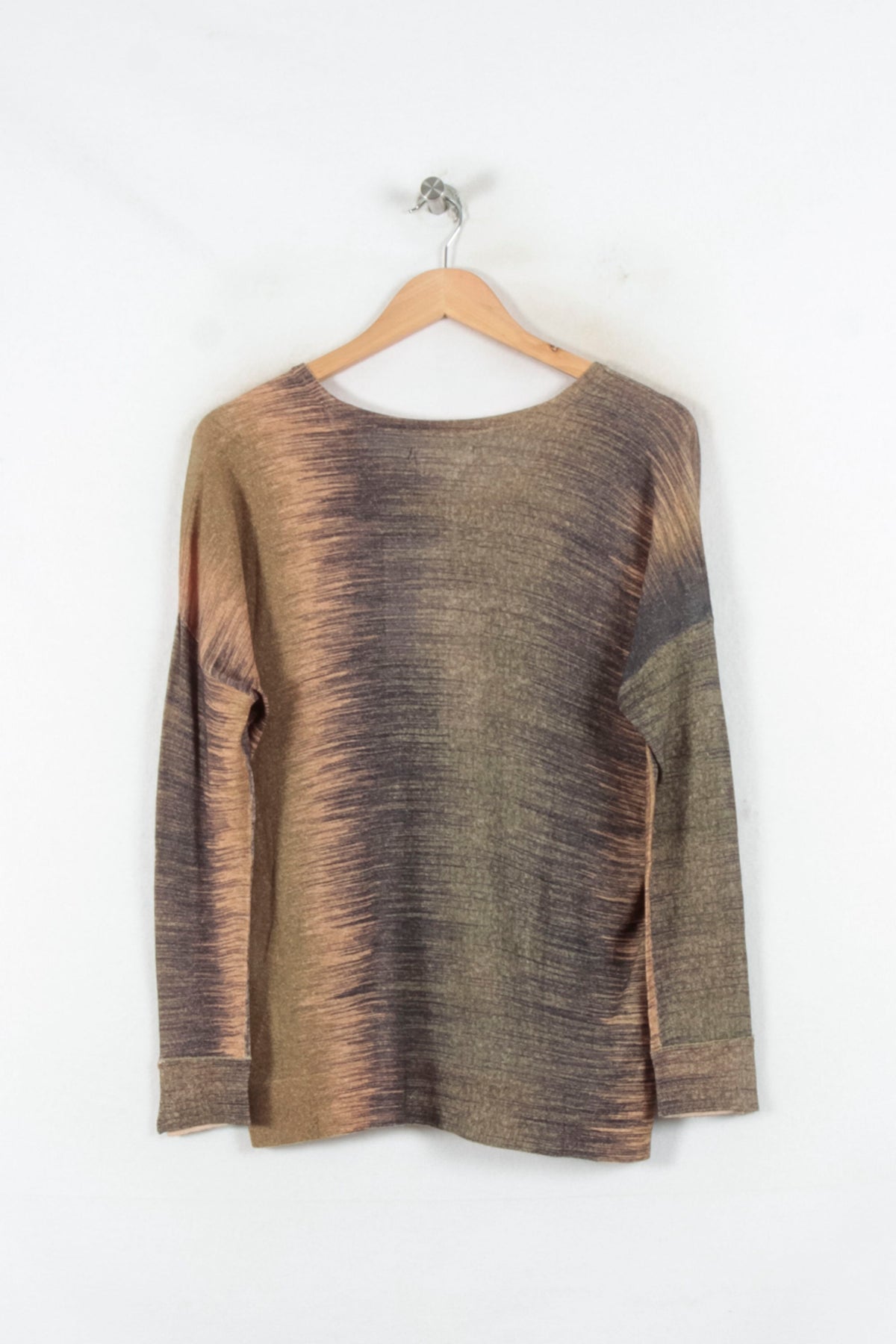 Pull multicolore Notshy Cashmere, taille M/38, à col en V, manches longues et coupe droite. Réalisé dans une matière fine et vaporeuse, ce pull présente un dégradé de couleurs subtiles façon brossée qui lui confère une touche moderne et artistique, tout en offrant une grande douceur. Idéal pour apporter une note élégante et décontractée à vos journées au bureau ou à un déjeuner entre amis.
