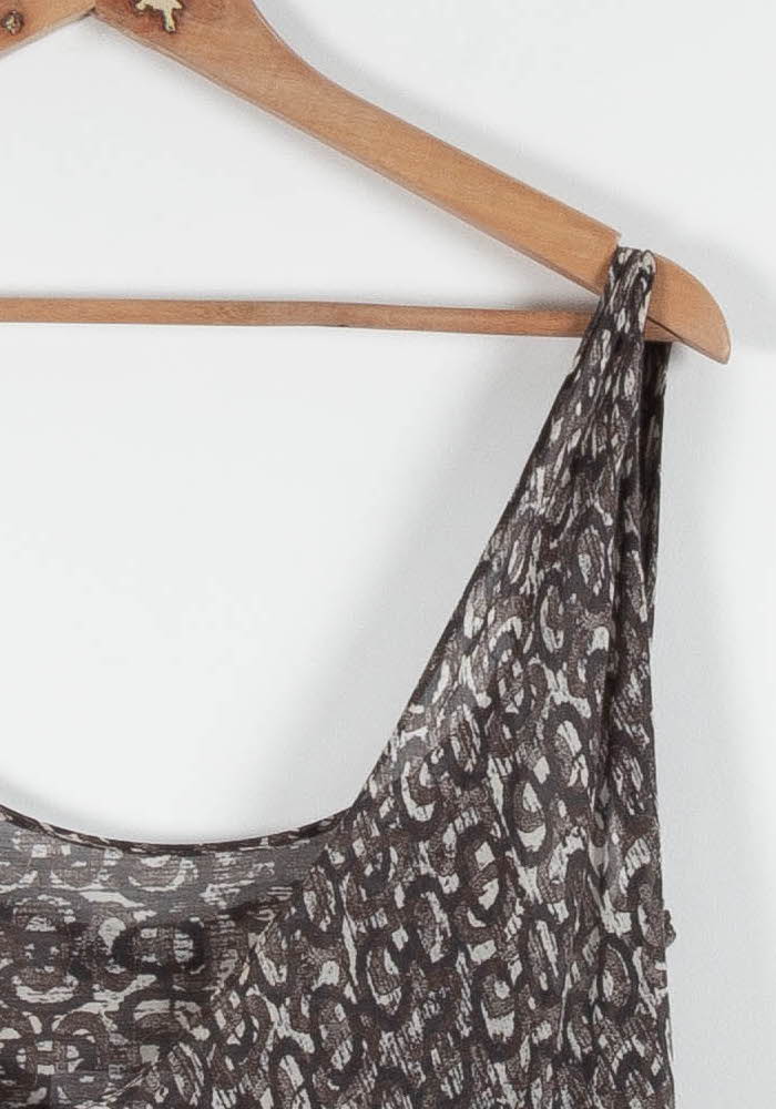 Robe IKKS - Titre : Robe imprimée asymétrique marron, Taille XL/42, Marque IKKS. Réalisée dans une matière fluide et légère, cette robe arbore un imprimé graphique marron avec une coupe asymétrique et des fines bretelles, lui conférant une allure singulière et moderne. Idéale pour une soirée estivale ou une occasion décontractée où élégance et confort sont de mise.