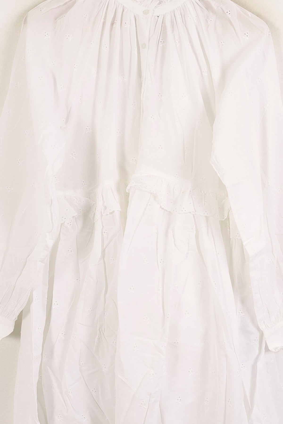 Robe blanche Petite Mendigote, taille M/38, élégante et fluide, parfaite pour une allure intemporelle. Confectionnée dans une matière légère à l’aspect vaporeux, cette robe se distingue par son col boutonné, ses manches longues bouffantes avec poignets élastiqués et un jeu de volants délicats à la taille qui lui apportent raffinement et originalité. Idéale pour une journée estivale ou une sortie décontractée en ville.