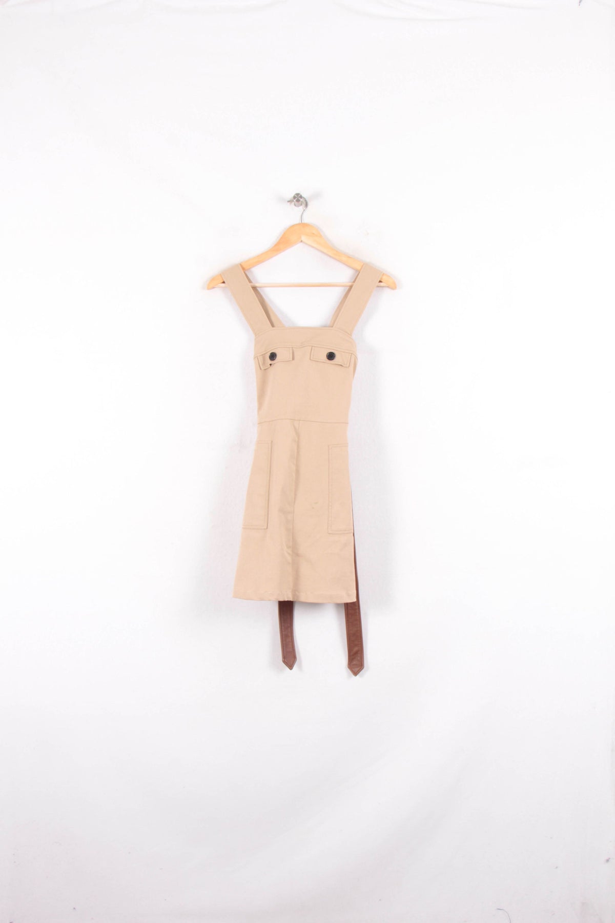 Robe beige Claudie Pierlot taille S/36, confectionnée dans une coupe ajustée aux larges bretelles et finitions à boutons contrastants. Ce modèle présente une matière effet coton structurée, des poches plaquées à l’avant et une ceinture à nouer sur l’arrière qui apportent du caractère et une touche d’originalité à la pièce. Parfaite pour une journée citadine élégante ou un déjeuner estival entre amis.