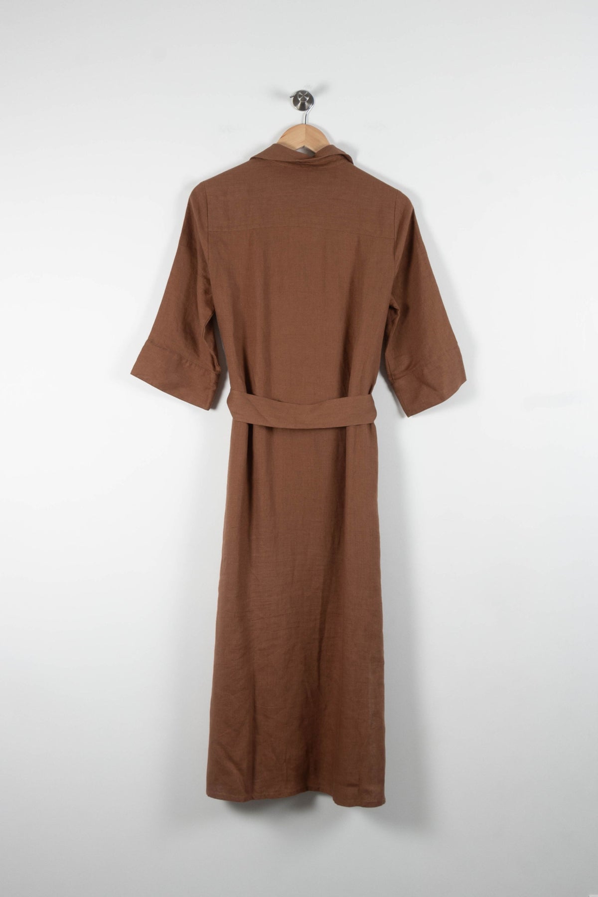 Robe chemise longue marron Caroll taille M/38, élégante et intemporelle, idéale pour toutes les saisons. Confectionnée dans une matière légère et fluide, elle se distingue par sa ceinture à nouer à la taille, des manches trois-quarts et une boutonnière discrète, offrant une silhouette raffinée et féminine. Parfaite pour une journée au bureau ou une sortie décontractée en ville.