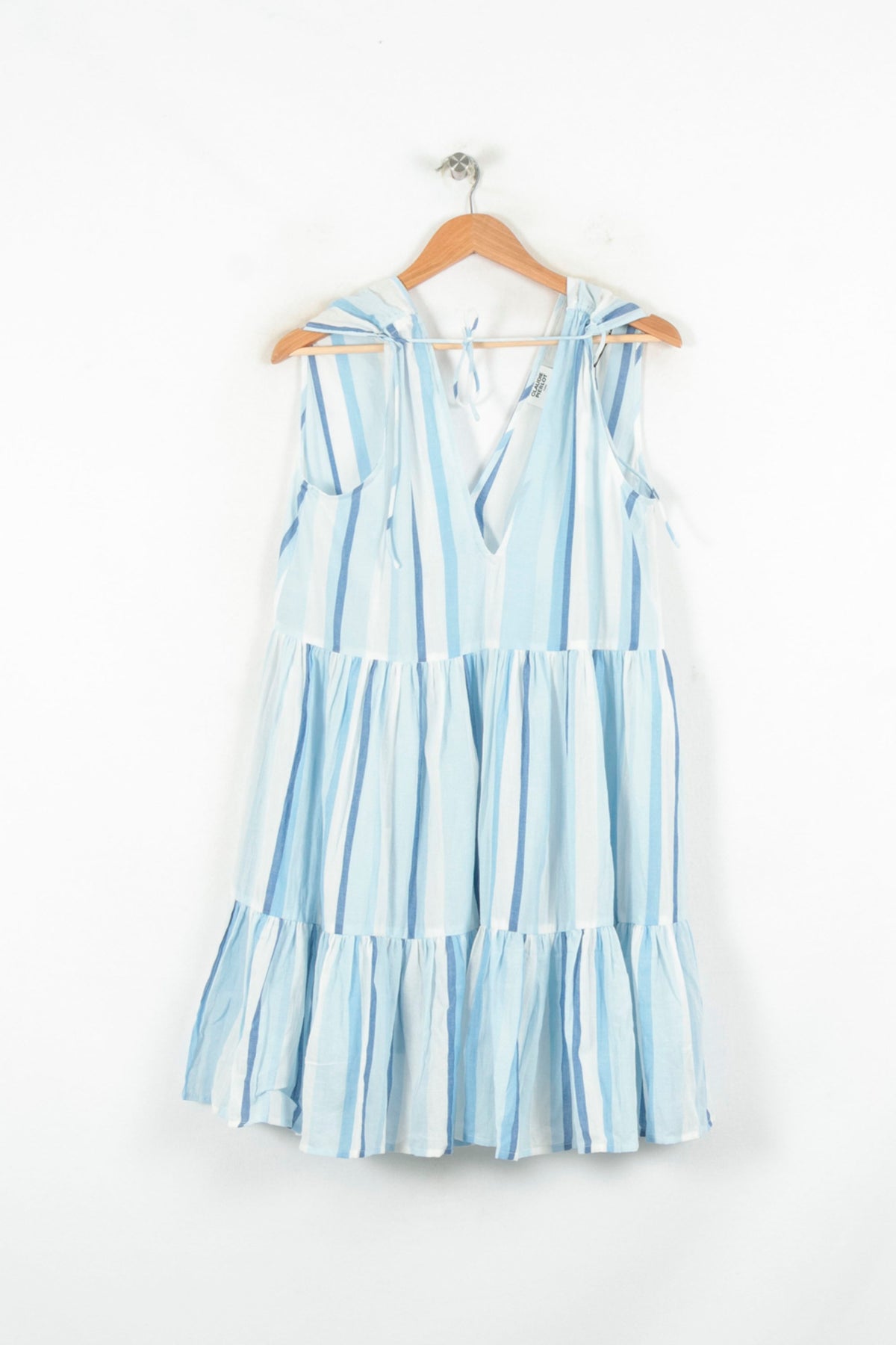 Robe Claudie Pierlot bleue à rayures, taille M/38, une pièce estivale élégante signée par la marque française. Confectionnée dans un tissu léger offrant un tombé fluide, cette robe se distingue par ses rayures verticales dans plusieurs nuances de bleu, son col V délicat, son découpage à volants et son lien à nouer au dos, pour une allure raffinée et décontractée. Idéale pour un déjeuner en terrasse, une promenade en bord de mer ou une journée d'été en ville.