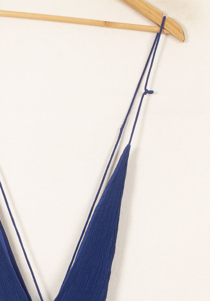 Robe bleu Karma Koma en taille M/38, au décolleté profond et fines bretelles. La matière fluide et légère ainsi que les fines bretelles confèrent à cette pièce une allure sophistiquée et aérienne, pour un rendu résolument moderne. Idéale pour une soirée estivale ou un dîner élégant.