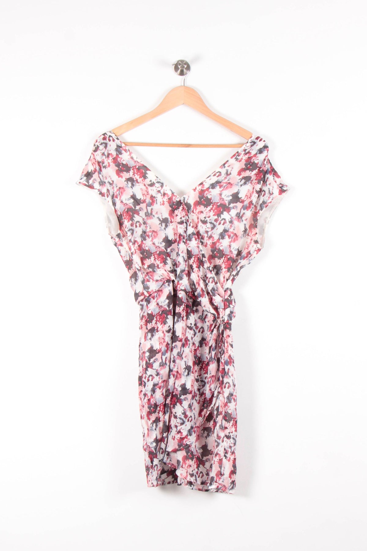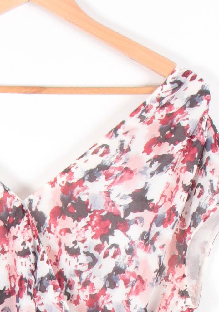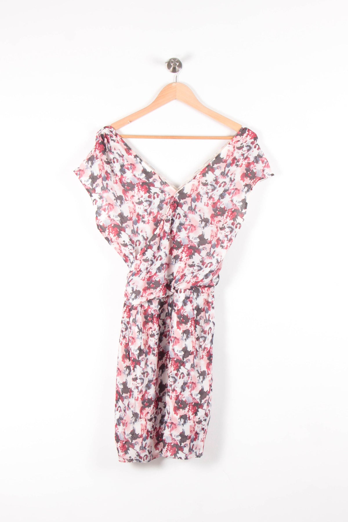 Robe IKKS taille L/40, motif bordeaux multicolore, coupe fluide et élégante. Confectionnée dans un tissu léger et transparent, cette robe se distingue par son imprimé floral abstrait, sa ceinture à nouer qui souligne la taille et ses manches courtes flottantes, apportant une touche d’originalité et de raffinement. Parfaite pour une garden-party estivale ou une cérémonie décontractée.