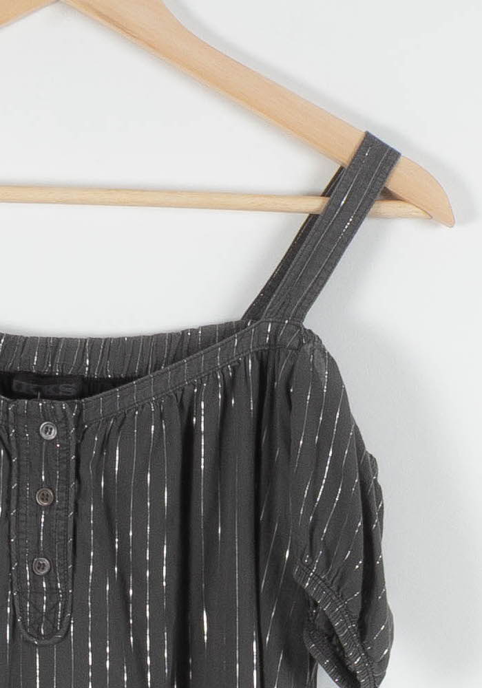 Robe IKKS grise, taille XL/42, élégante et moderne, idéale pour un look raffiné au quotidien. Confectionnée dans une matière fluide ornée de fines rayures verticales argentées, cette robe droite à bretelles et manches courtes apporte une touche lumineuse, tandis que la patte de boutonnage devant offre un détail sophistiqué. Parfaite pour un dîner entre amis ou une sortie estivale où l’élégance décontractée est de mise.