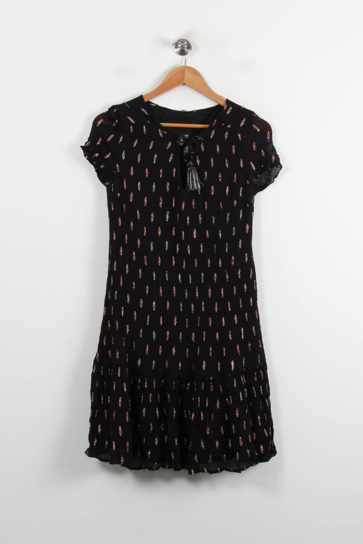 Robe noire IKKS taille L/40, ornée de motifs discrets et raffinés sur l'ensemble du tissu. Confectionnée dans une matière légère, cette robe présente des manches courtes, un col à liens décoratifs et des détails plissés en bas, conférant à la silhouette une note de féminité et de mouvement. Idéale pour une journée d'été ou une sortie décontractée entre amis.