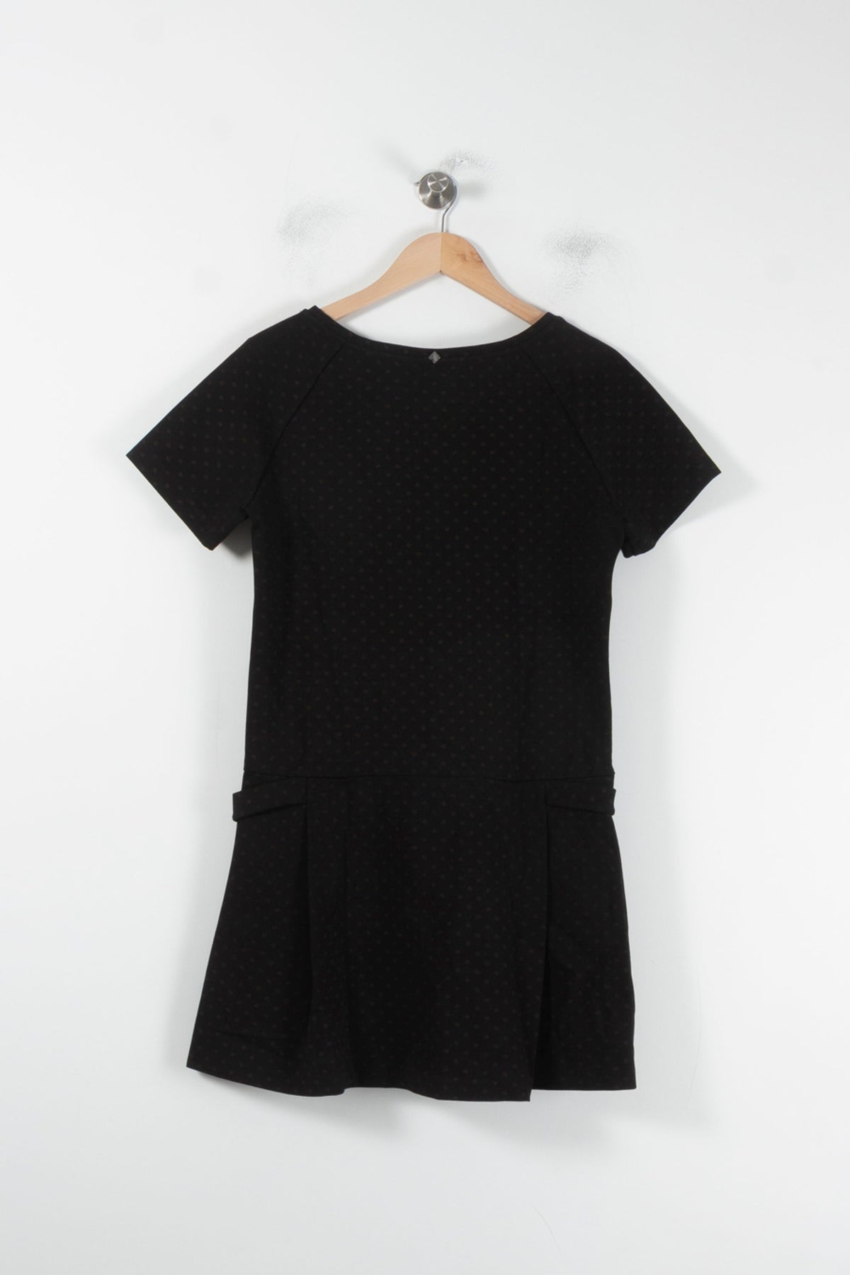 Robe noire courte I.Code taille L/40, coupe droite, manches courtes, détails boutonnés à la taille. Confectionnée dans un tissu principal composé de 70% viscose, 26% polyamide et 4% élasthanne, cette robe se distingue par son léger motif discret et ses deux pattes boutonnées qui apportent une touche d’originalité élégante. Idéale pour une journée au bureau ou un dîner élégant grâce à sa sobriété et son raffinement.