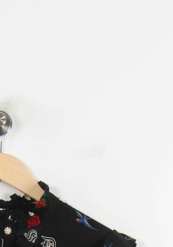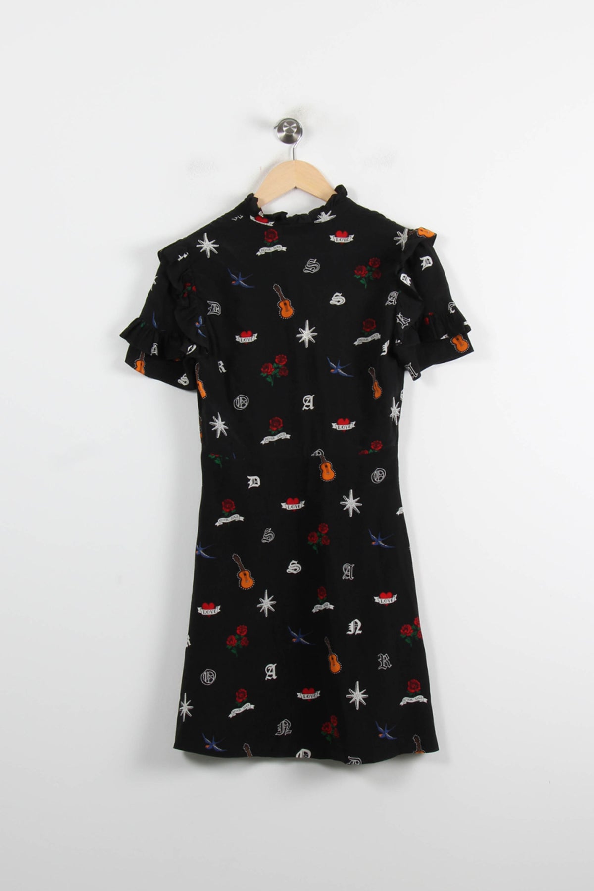 Robe courte imprimée Sandro noire, taille M/38, aux motifs multicolores et détails raffinés. Confectionnée dans une matière légère, elle se distingue par ses volants délicats sur les manches et le long de la boutonnière, ainsi que par son imprimé original composé de guitares, roses et autres symboles colorés pour une touche d’originalité unique. Idéale pour une sortie entre amis ou un événement décontracté en journée.
