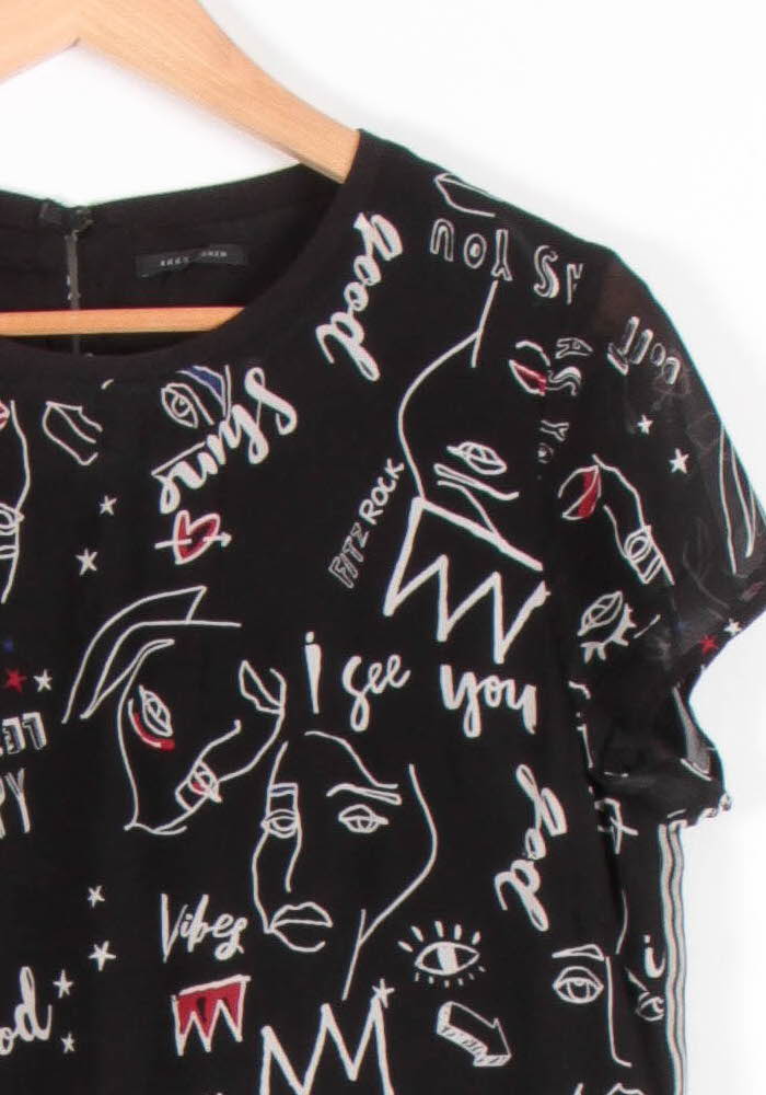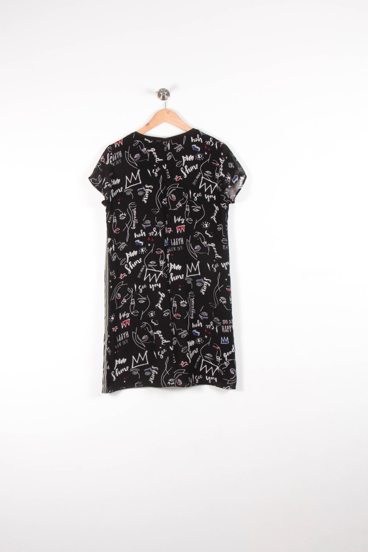 Robe courte noire imprimée à motifs graphiques IKKS, taille M/38, à manches courtes et coupe droite. La matière légère et fluide apporte un tombé naturel, tandis que les détails d’imprimés artistiques et ludiques en blanc et rouge confèrent à cette pièce une identité moderne et originale. Idéale pour une sortie en ville ou un afterwork, cette robe allie confort et style contemporain.