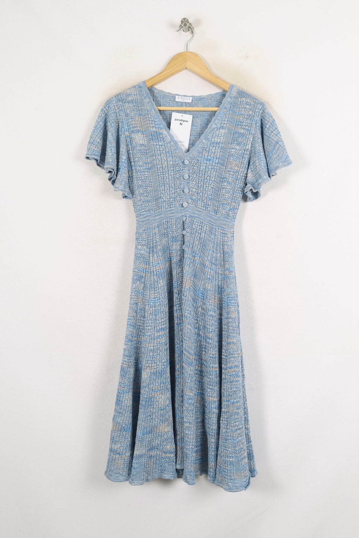 Robe Claudie Pierlot bleu, taille M/38, élégante et féminine à manches courtes et boutonnage sur le devant. Confectionnée dans une matière à motif texturé, elle se distingue par ses détails de boutons recouverts et ses manches volantées, apportant une allure unique et raffinée. Idéale pour une garden-party estivale ou un brunch chic en ville.