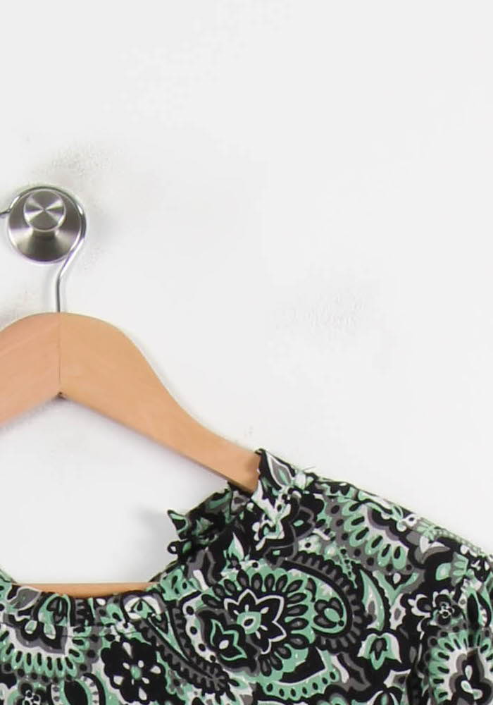 Robe courte IKKS vert à motifs paisley, taille L/40, idéale pour une silhouette féminine et élégante. Confectionnée dans un tissu léger au toucher agréable, cette robe est rehaussée d’un imprimé original mêlant différentes teintes de vert et de noir, avec un détail de volant discret à la base qui lui confère une touche unique. Parfaite pour une journée d’été en ville ou un déjeuner entre amis.