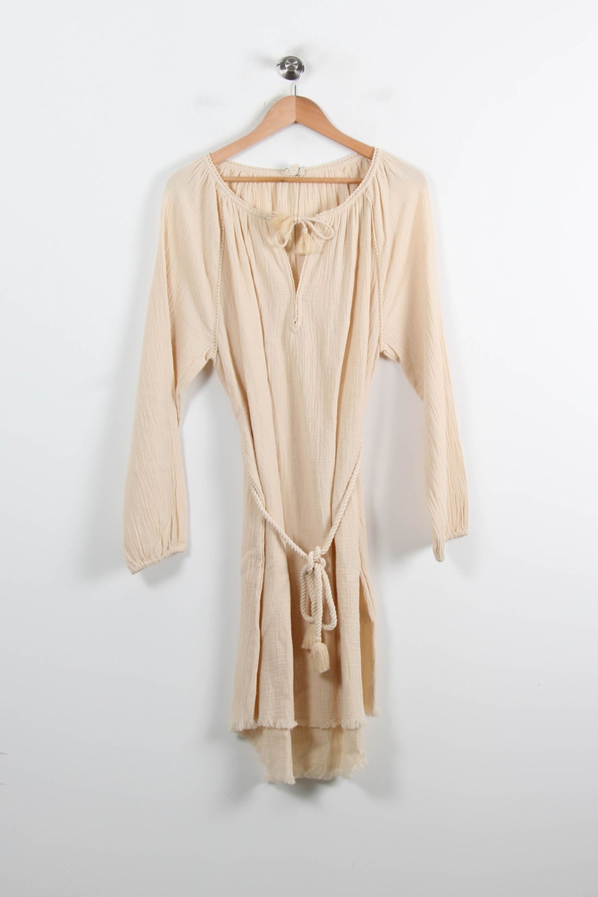 Robe beige Louise Misha en taille XL/42, dotée de manches longues et d’une ceinture corde élégante à la taille. Confectionnée dans une matière légère et texturée, cette robe présente des finitions délicatement frangées au bas et un lien à nouer à l’encolure, offrant une allure à la fois naturelle et sophistiquée. Parfaite pour une sortie estivale ou un brunch en terrasse, cette robe combine confort et style avec subtilité.