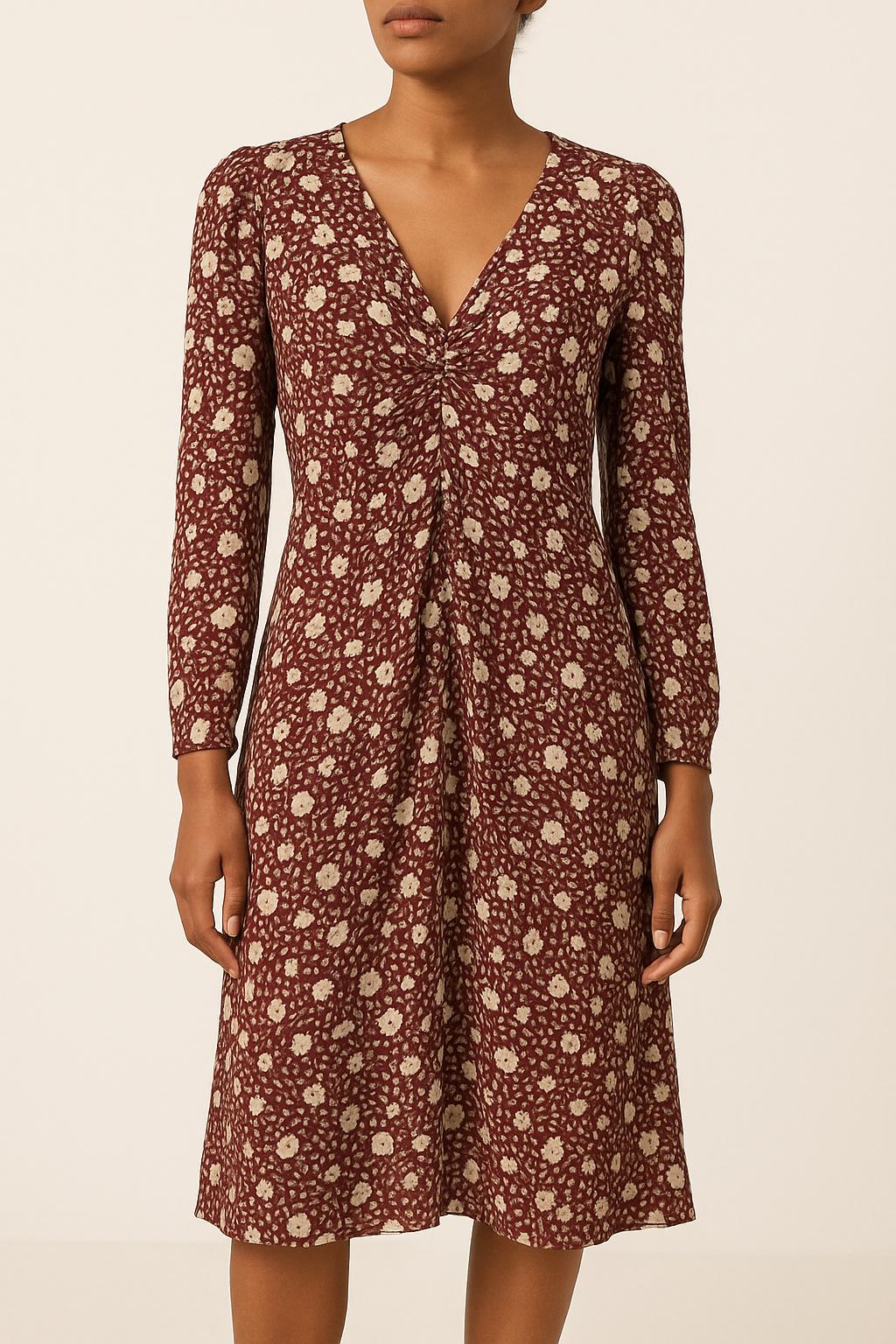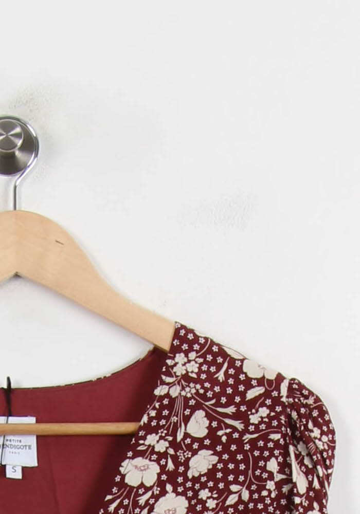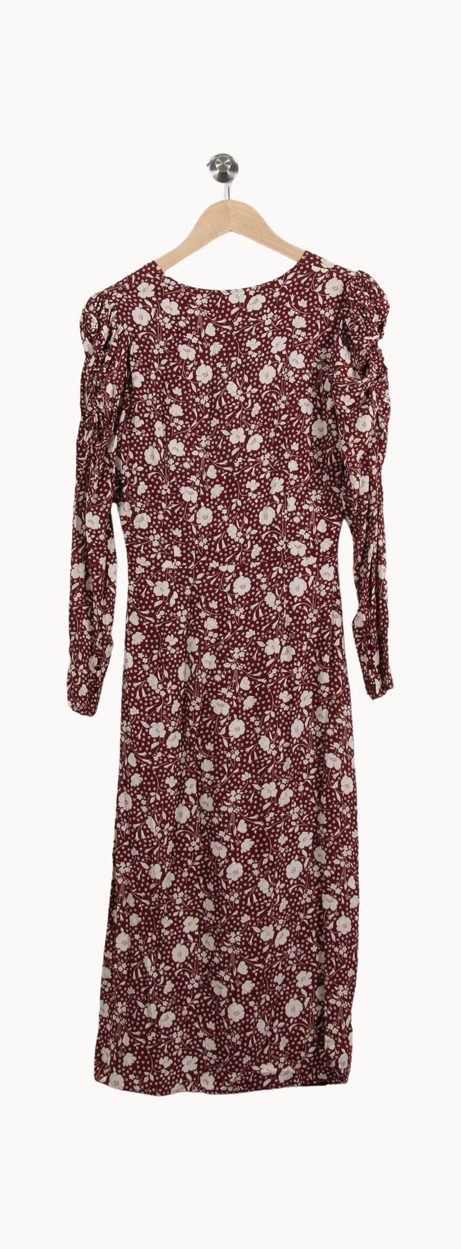 Robe longue à imprimé fleuri bordeaux Petite Mendigote, taille S/36, élégante et féminine. Confectionnée dans une matière fluide, elle est ornée d’un motif floral crème délicat, d’un décolleté en V et de manches longues légèrement froncées, créant une silhouette raffinée unique. Parfaite pour une soirée élégante ou une cérémonie estivale.