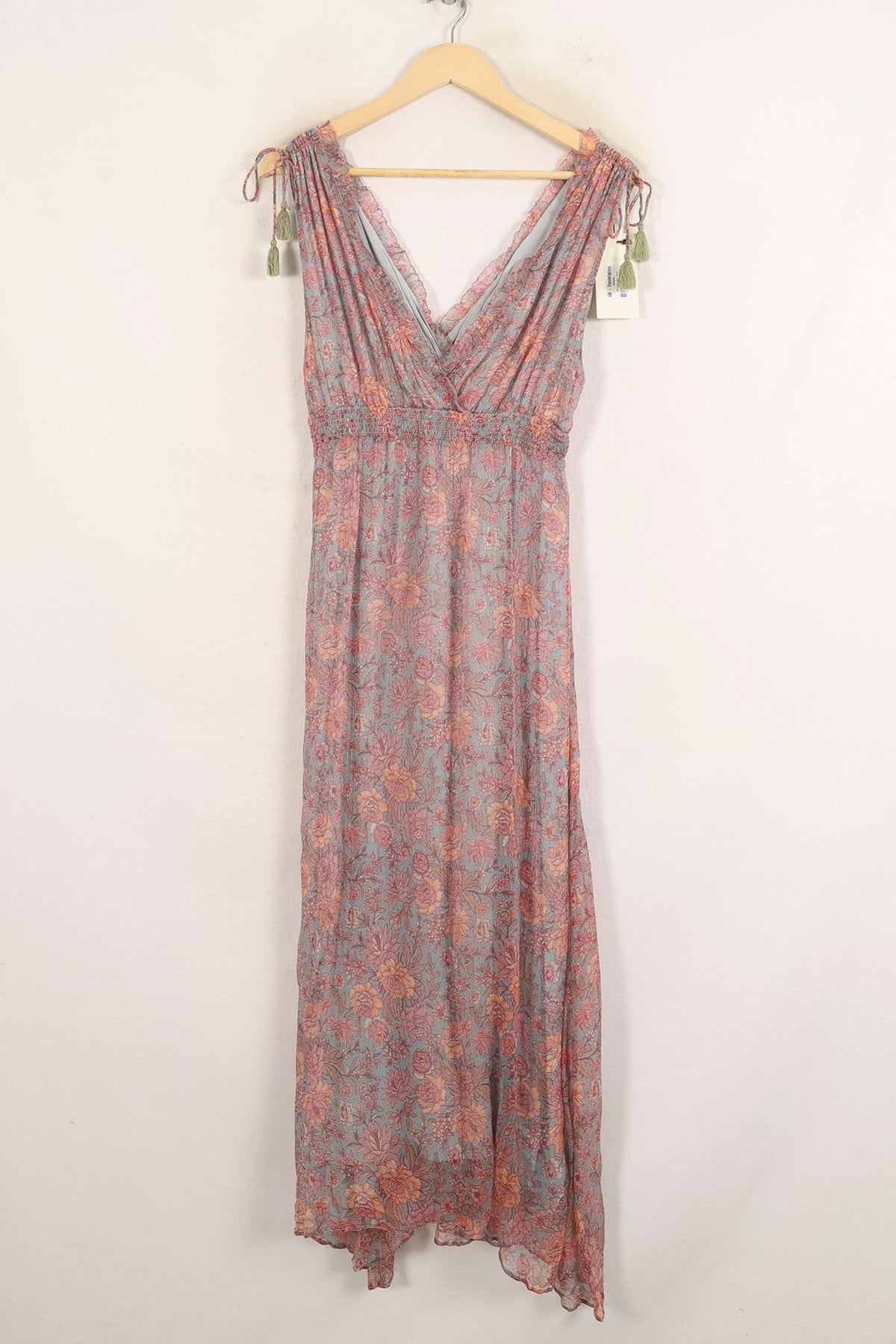 Robe longue multicolore Louise Misha, taille L/40, affichant une élégante coupe fluide à imprimé floral délicat. Confectionnée dans une matière légère et transparente, elle présente un joli décolleté en V, des épaules froncées rehaussées de liens ornés de pompons, et une taille smockée pour une silhouette féminine et raffinée. Parfaite pour une cérémonie estivale ou une garden-party, elle accompagnera vos moments élégants en toute légèreté.