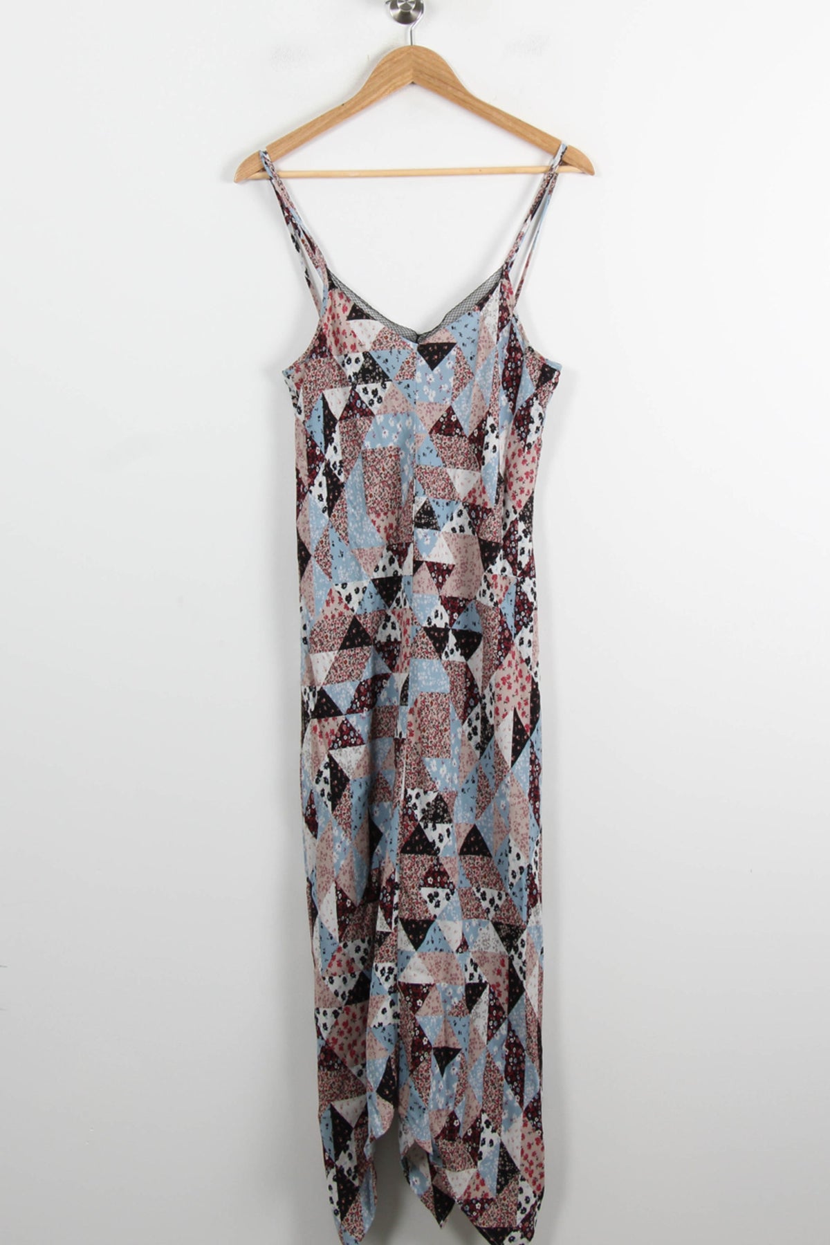 Robe longue multicolore IKKS, taille L/40, à fines bretelles et motif géométrique coloré. Sa matière fluide et légère, alliée à un imprimé original mêlant triangles et touches de nuances variées, confère à cette pièce une allure moderne et singulière. Idéale pour une journée estivale ou une sortie décontractée, elle sublimera votre silhouette avec élégance et confort.